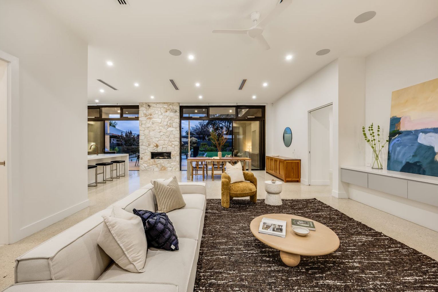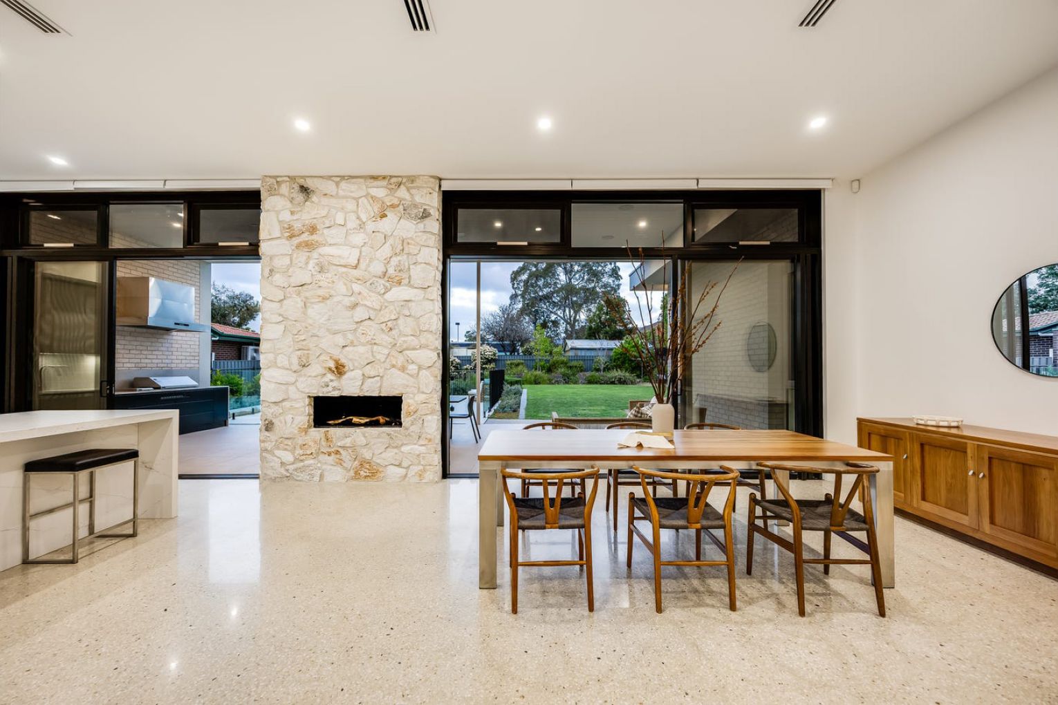 And then, the showstopper: an open-plan living pavilion where light pours through wall-to-wall windows. A stone-clad wood log gas fire anchors the space, built-in cabinetry lines the walls, and the kitchen sets new apex with a double-depth island, floor-to-ceiling stone, an enviable butler’s pantry, and Smeg Neptune Grey appliances (including dual MultiTech and pyrolytic ovens).