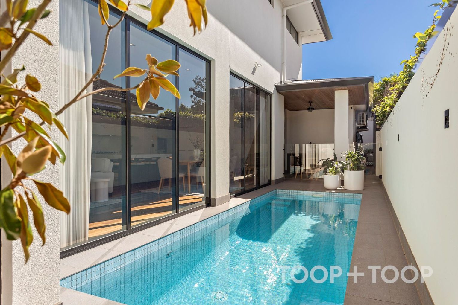 This seamless space overlooks the stunning, north-facing pool and alfresco BBQ area through picture windows, crafting the perfect oasis for relaxation and entertainment.