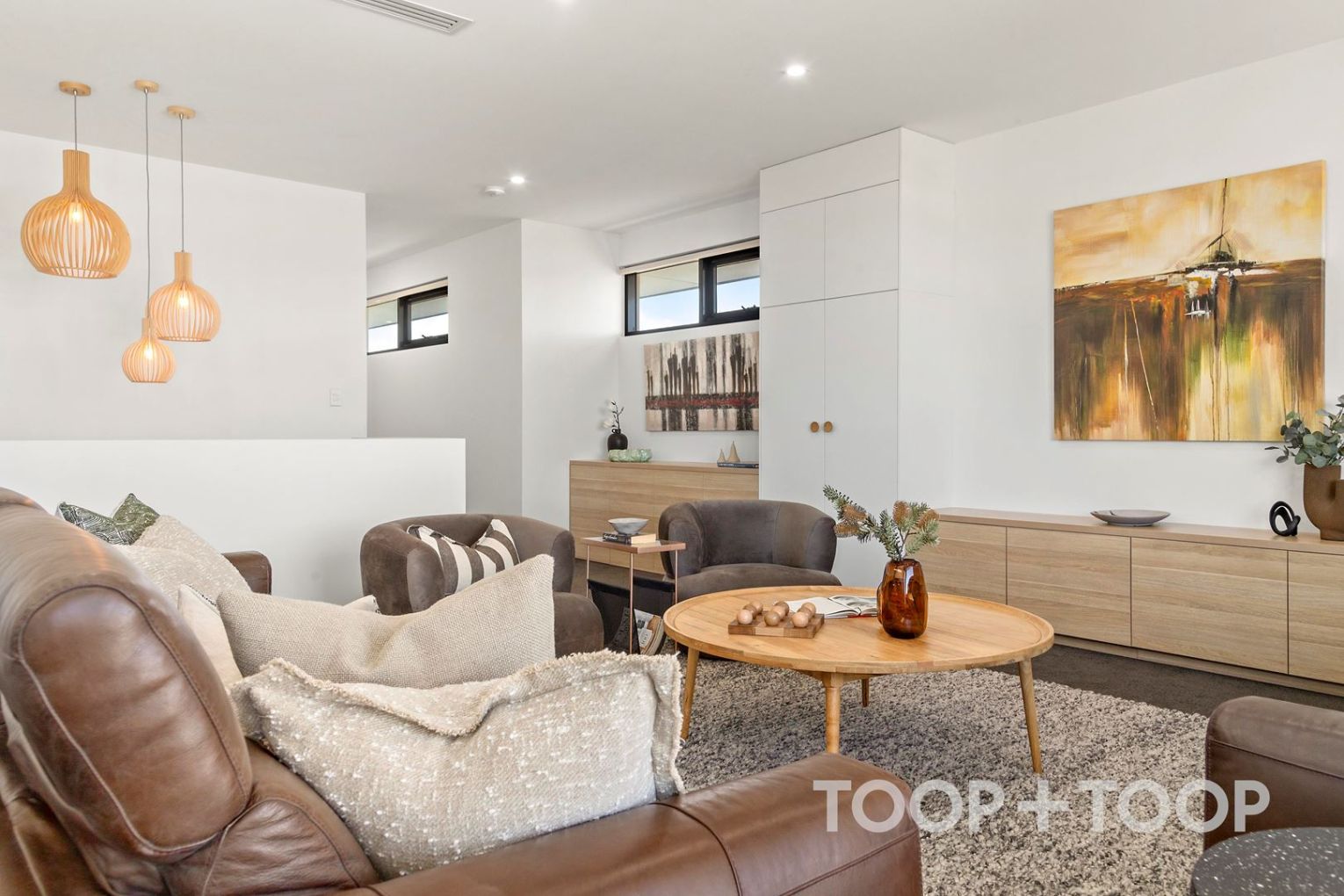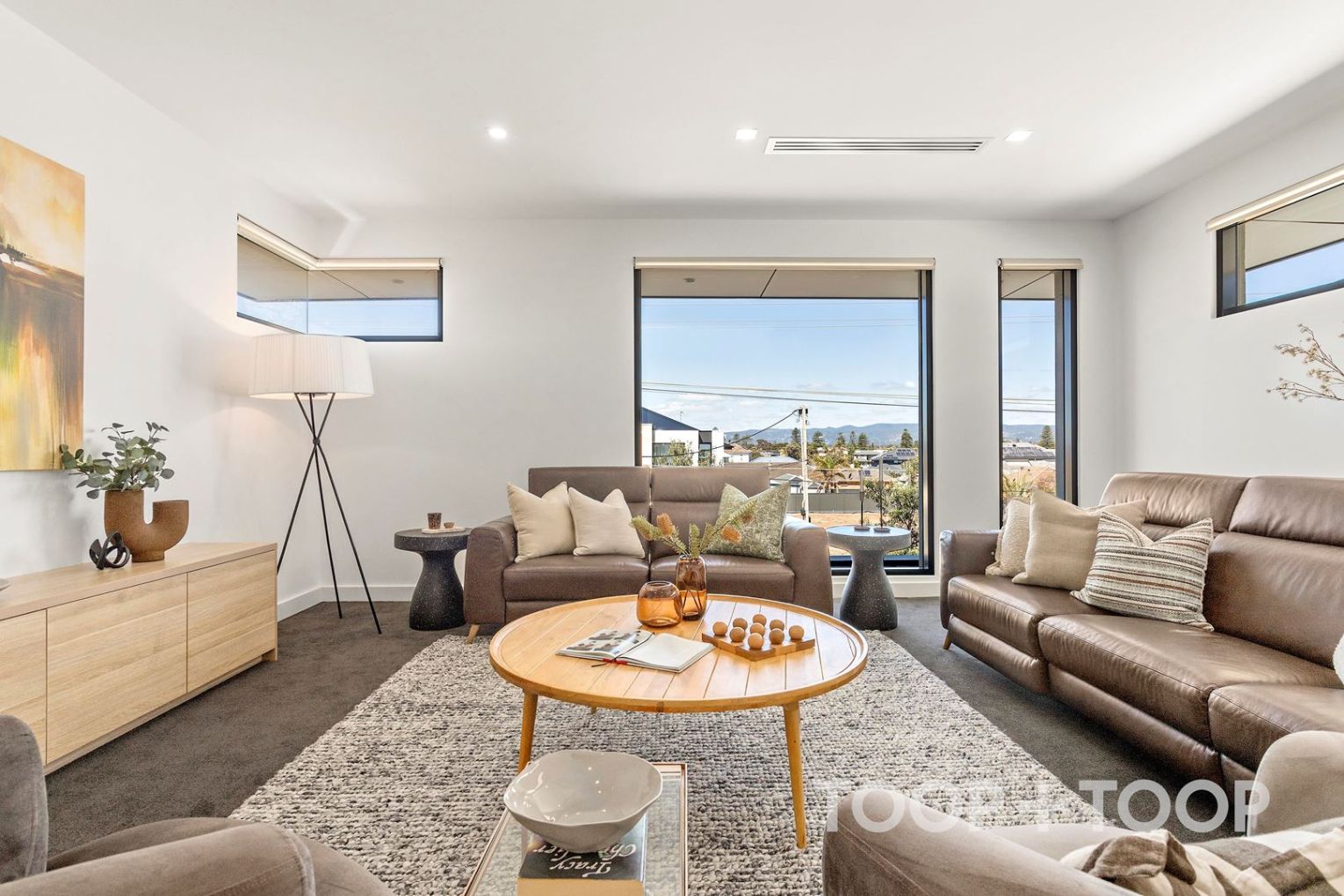 Venturing upstairs reveals a vast lounge area with breathtaking views of the Hills, alongside two spacious bedrooms.