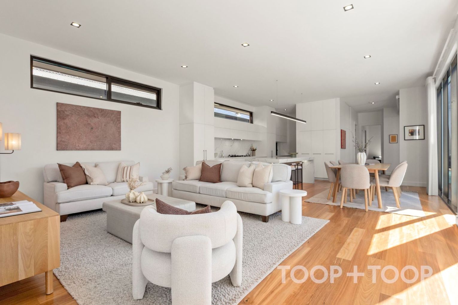 The journey begins as you step through the grand entrance, leading you into an expansive open-plan living space where natural light dances across sleek surfaces.