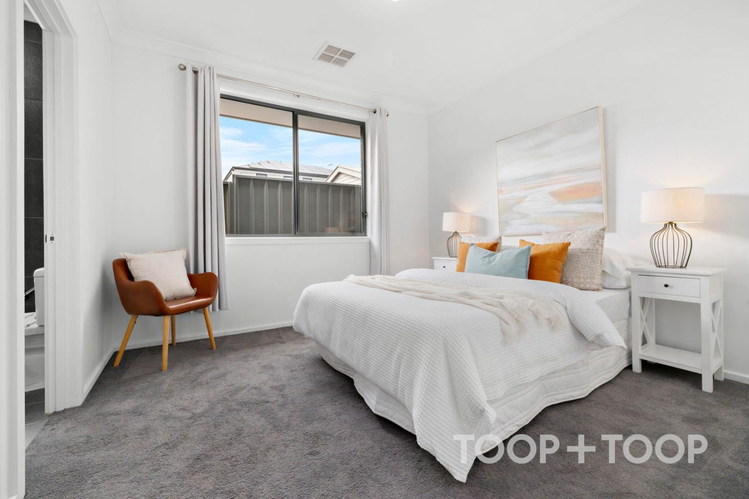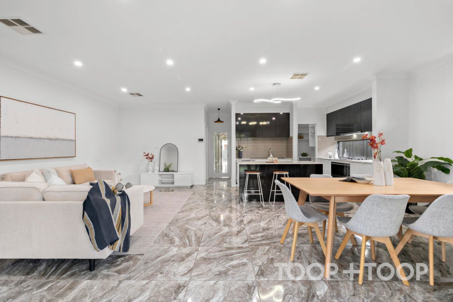 At the rear, an expansive open-plan family, dining, and kitchen zone flows effortlessly to the alfresco entertaining area — ideal for year-round gatherings. The sleek kitchen features stone benchtops, stainless-steel appliances, and a generous walk-in pantry, providing both practicality and style.