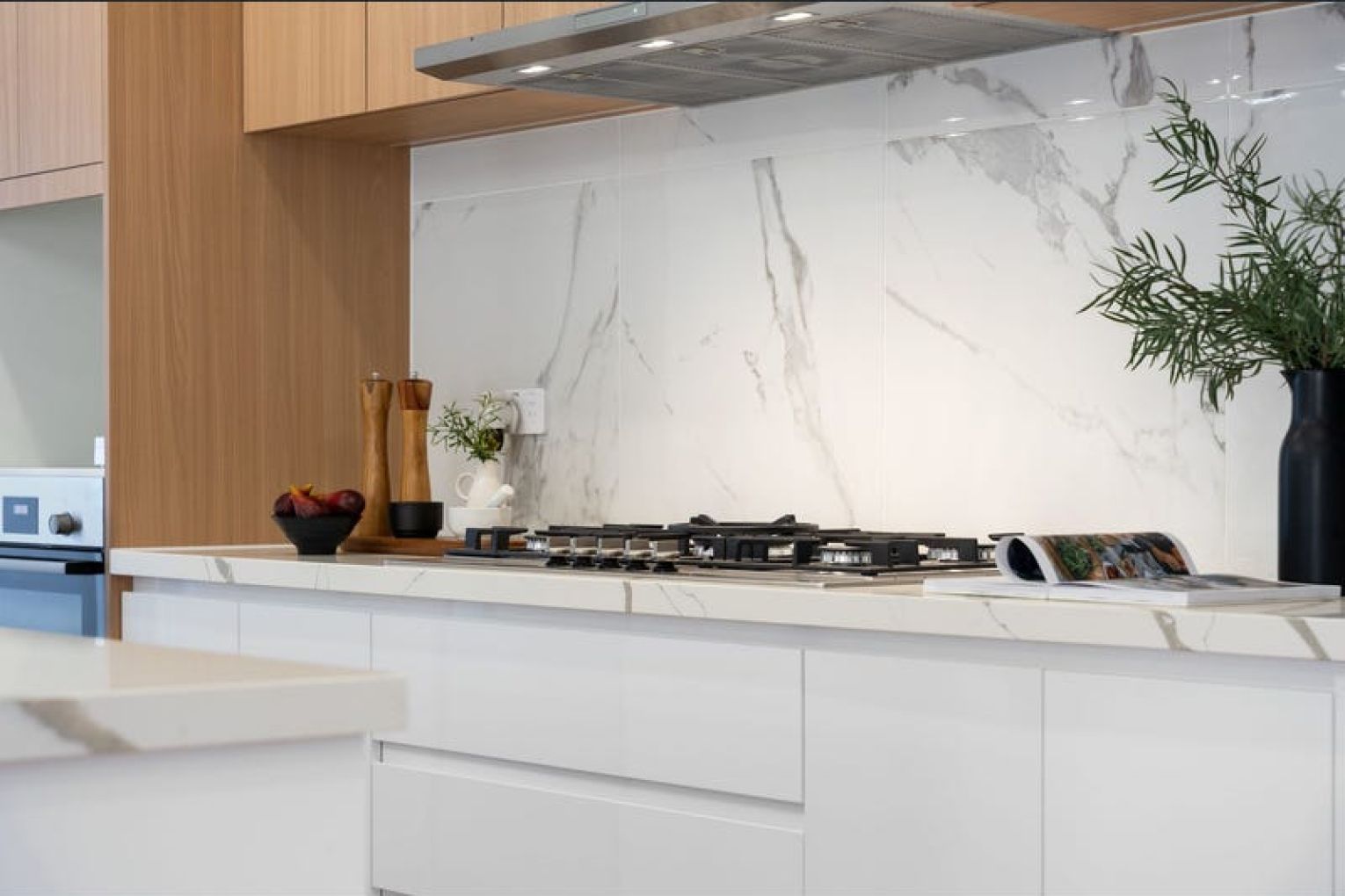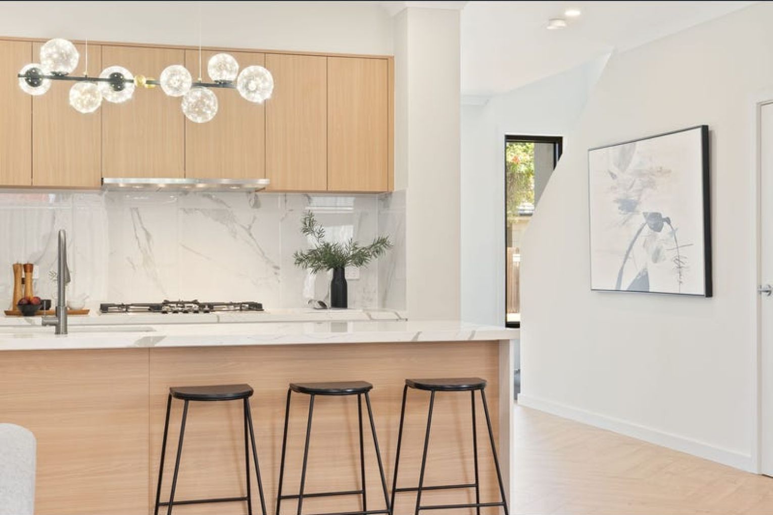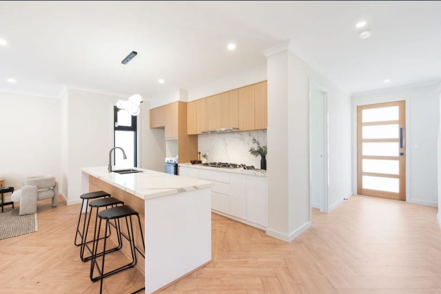 – Gourmet Kitchen: Equipped with double-cut stone benchtops, an island breakfast bar with strip and pendant lighting, and premium stainless appliances.