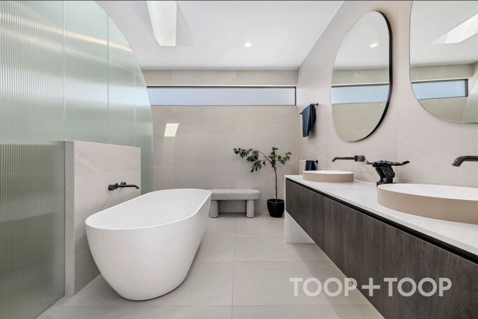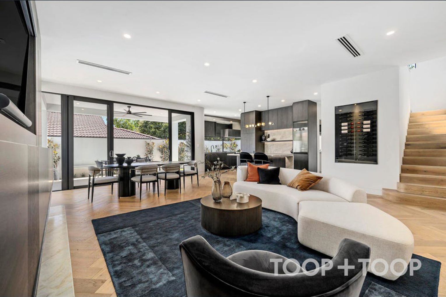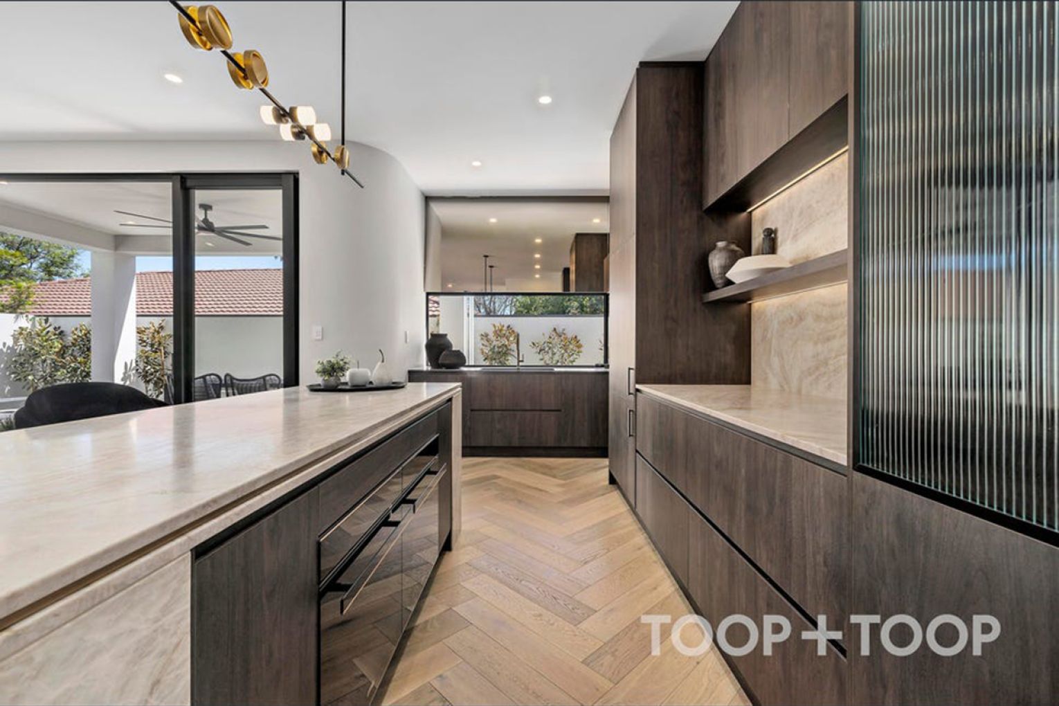 Balancing beauty with functionality the kitchen forms an artistic centrepiece to everyday living and entertaining. Curved stone surfaces contrast elegantly against rich walnut joinery, integrated Smeg appliances and breathtaking Taj Mahal stone benchtops – creating a space that is as functional as it is a visual delight.