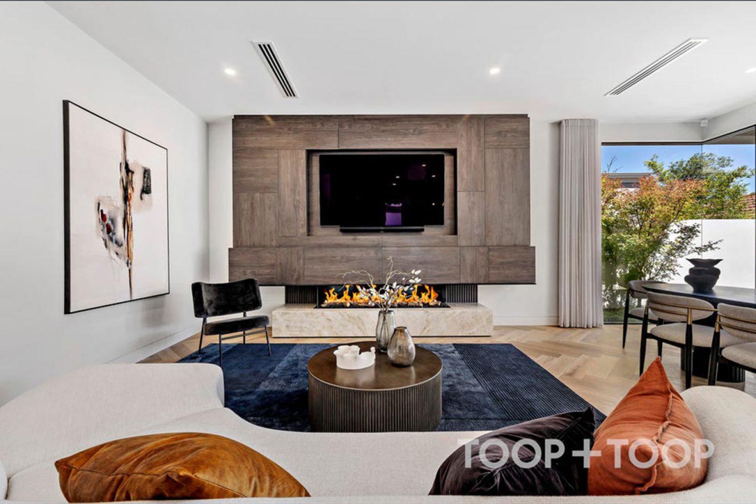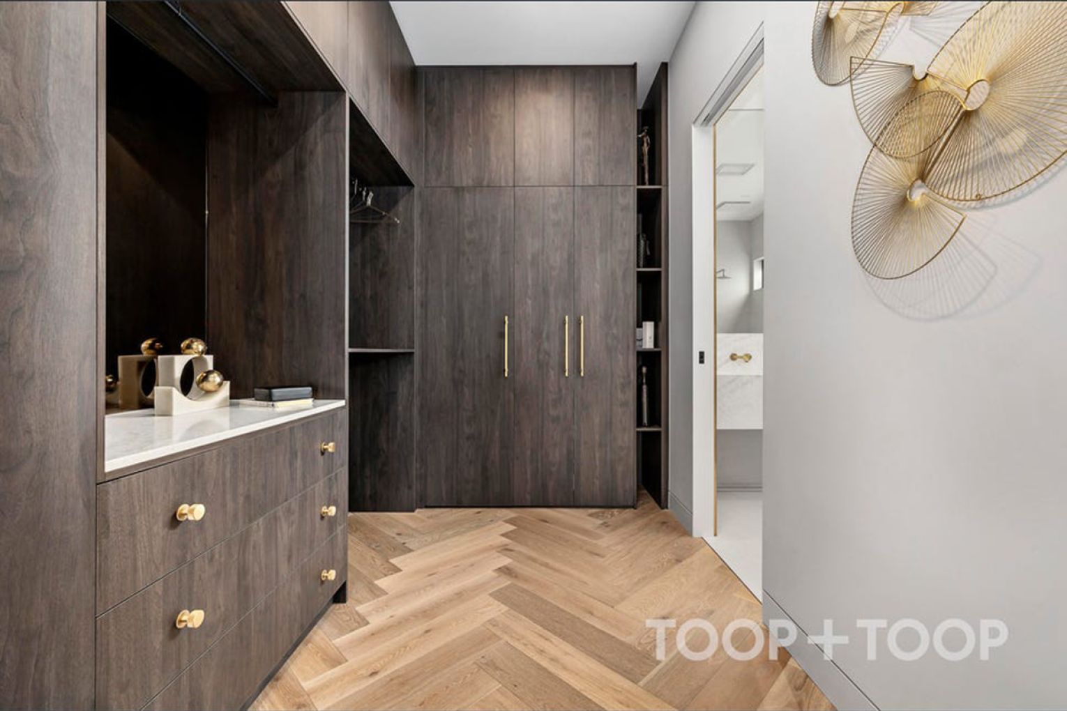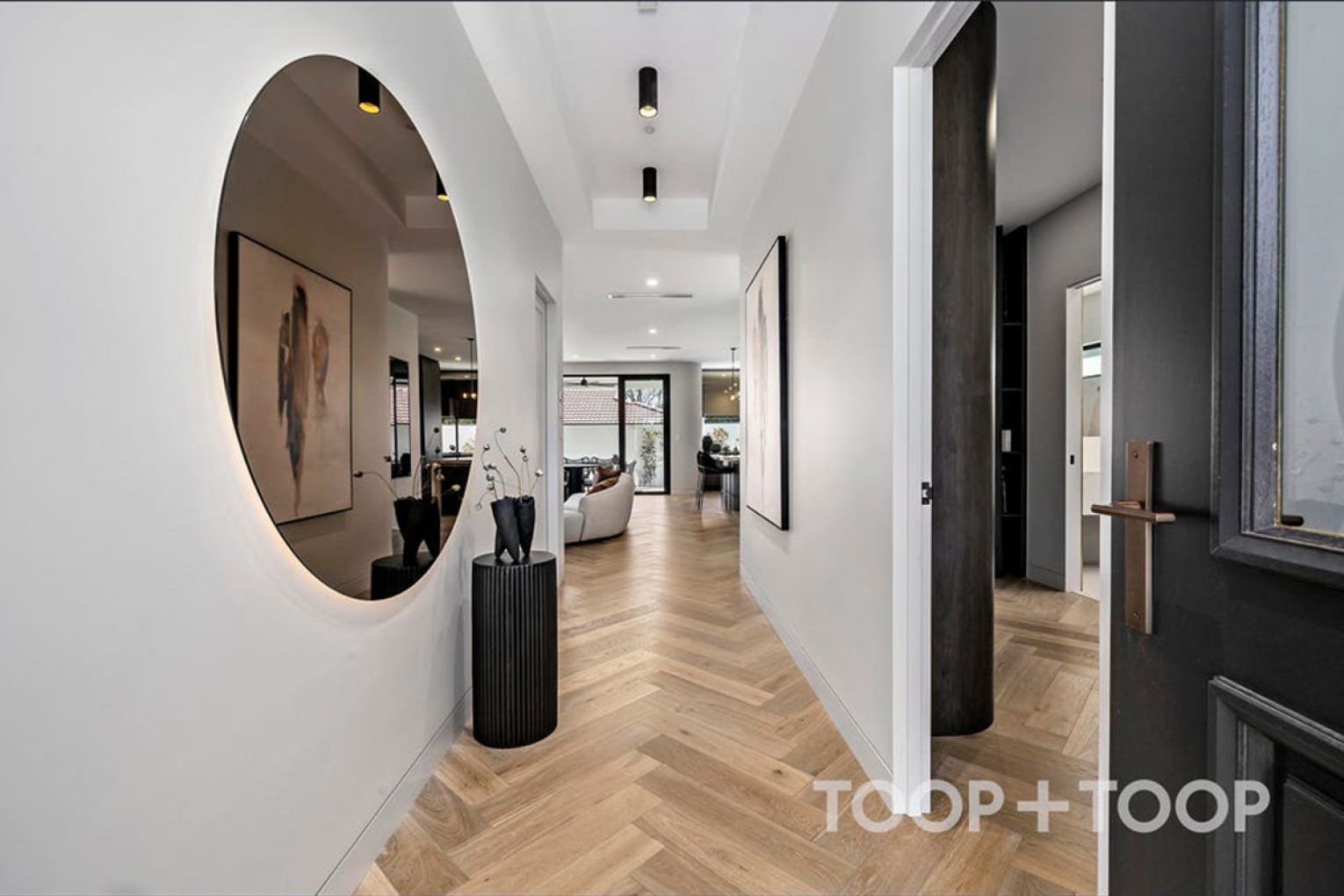 A striking first impression unfolds upon entry, where coffered ceilings and herringbone flooring frame a refined interior language that flows throughout.