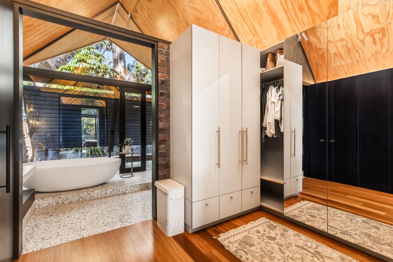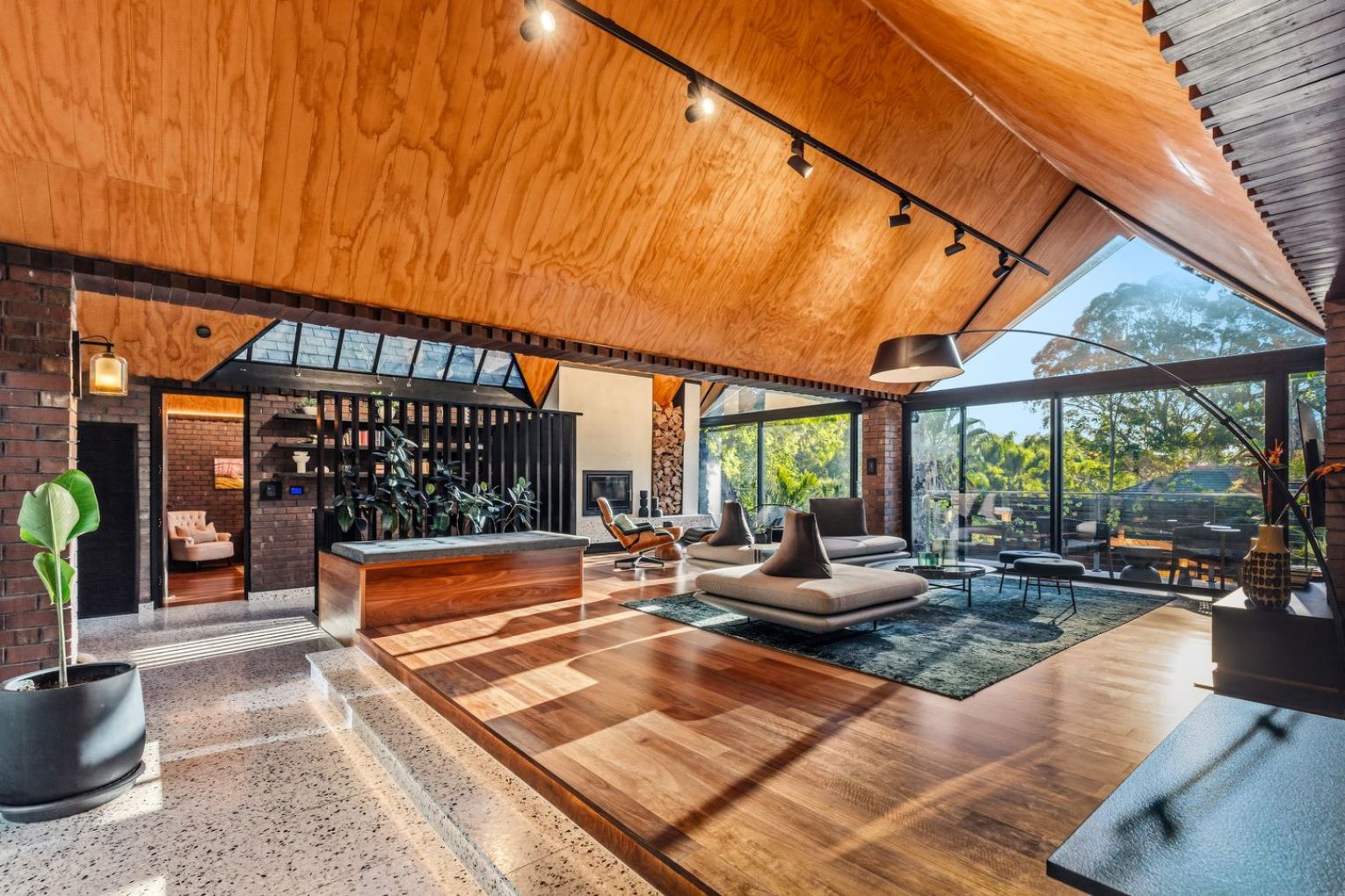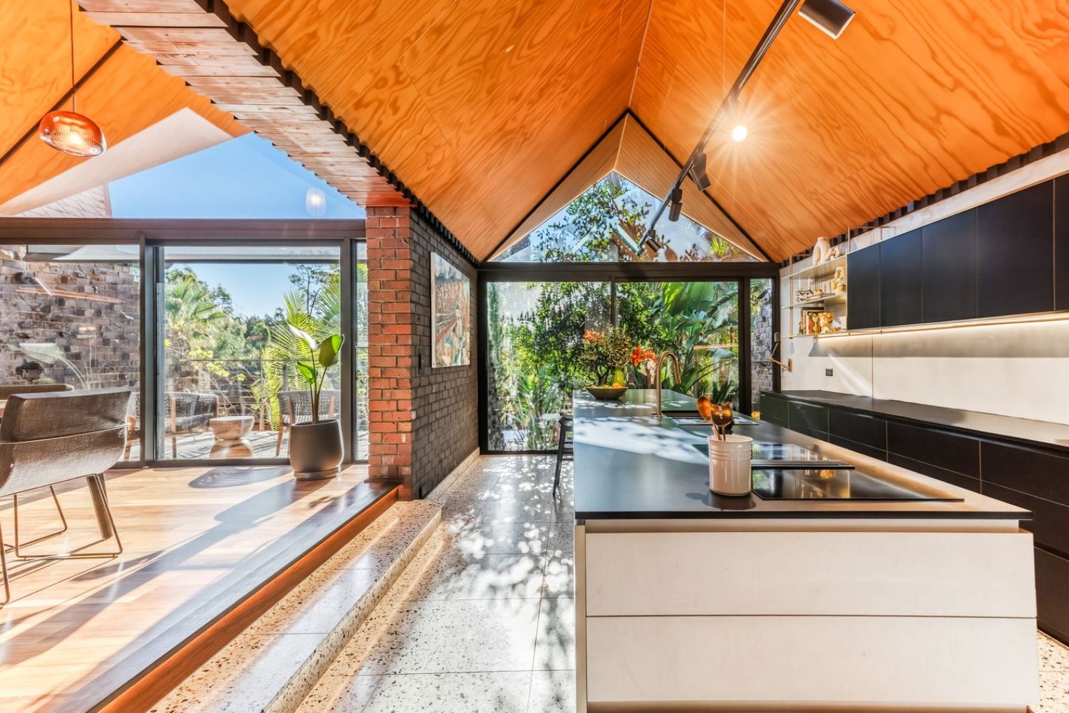 Inside, those forms translate to soaring timber lined cathedral ceilings that pull light deep into the interior, where walls of glazing dissolve the boundary between architecture and nature.