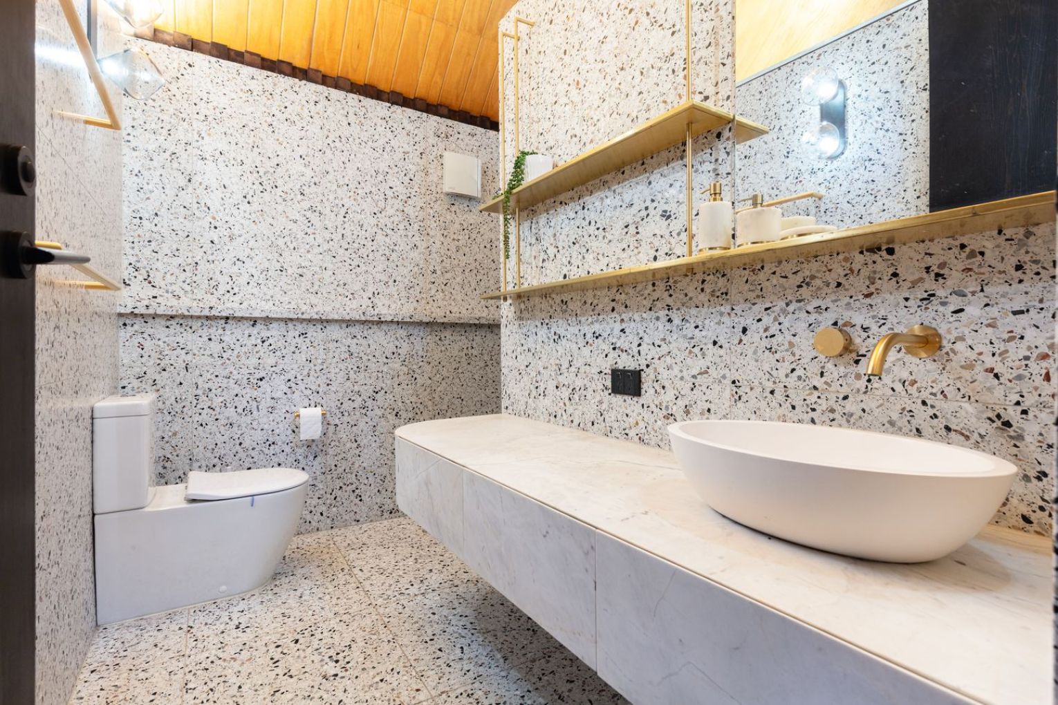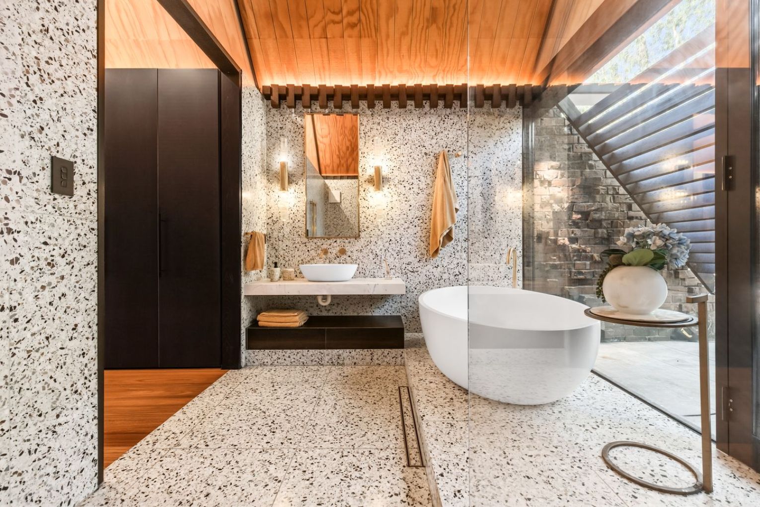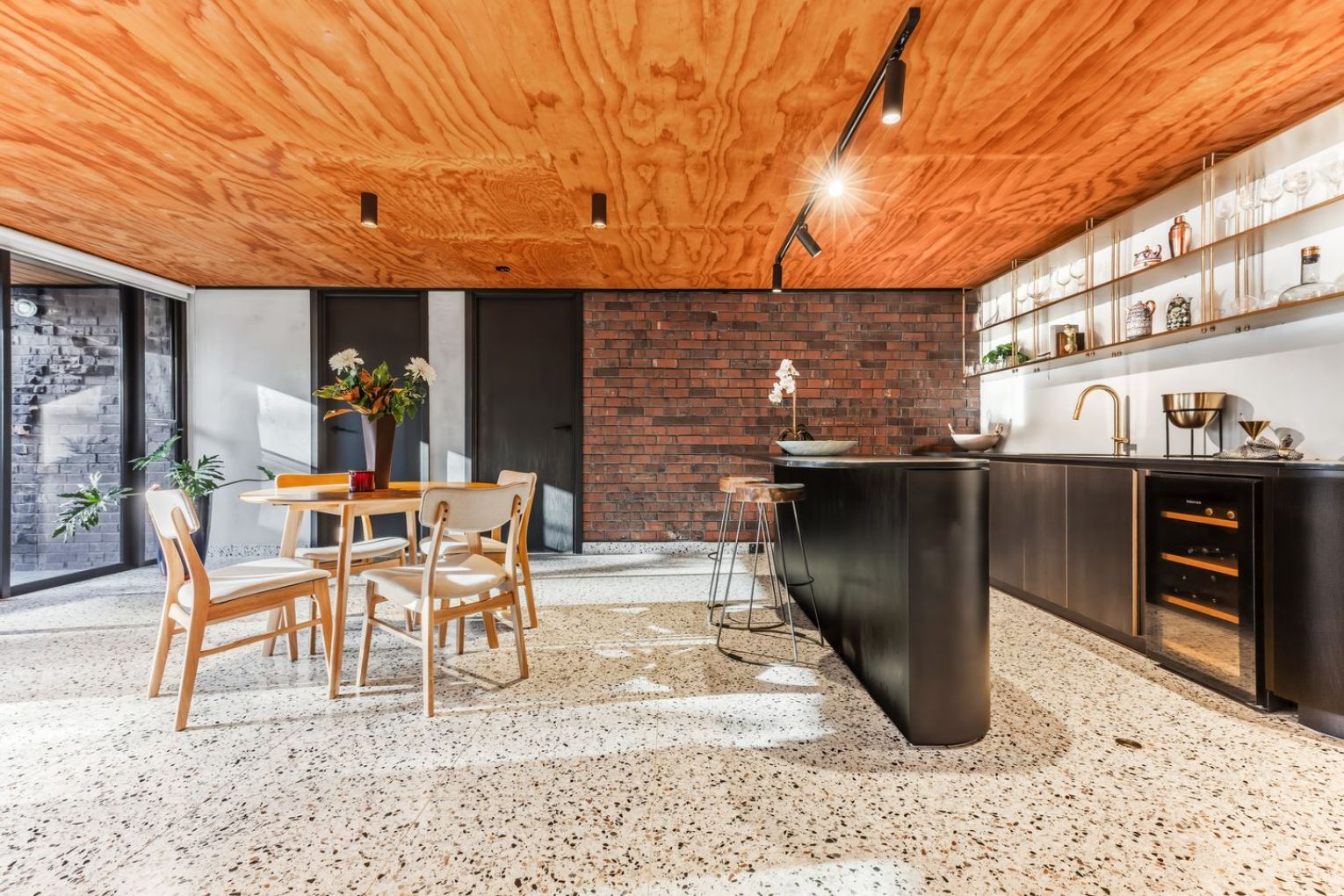 Heated terrazzo flooring, expanses of spotted gum, imported ply, Venetian plaster, marble and granite sit against exposed masonry and dark structural elements, a collection of finishes that honours the robustness of Whitford’s original construction while introducing a new level of warmth, precision and verve.