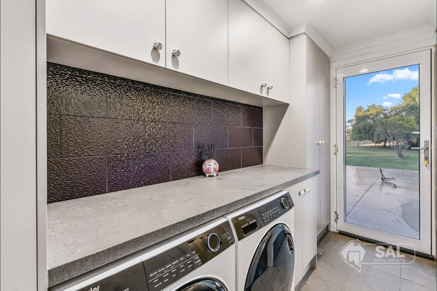 - Laundry with imported Brazilian Caesar Stone benchtop, overhead cabinetry, linen & utility storage, Haier 8.5kg washing machine & Haier 8kg dryer.
