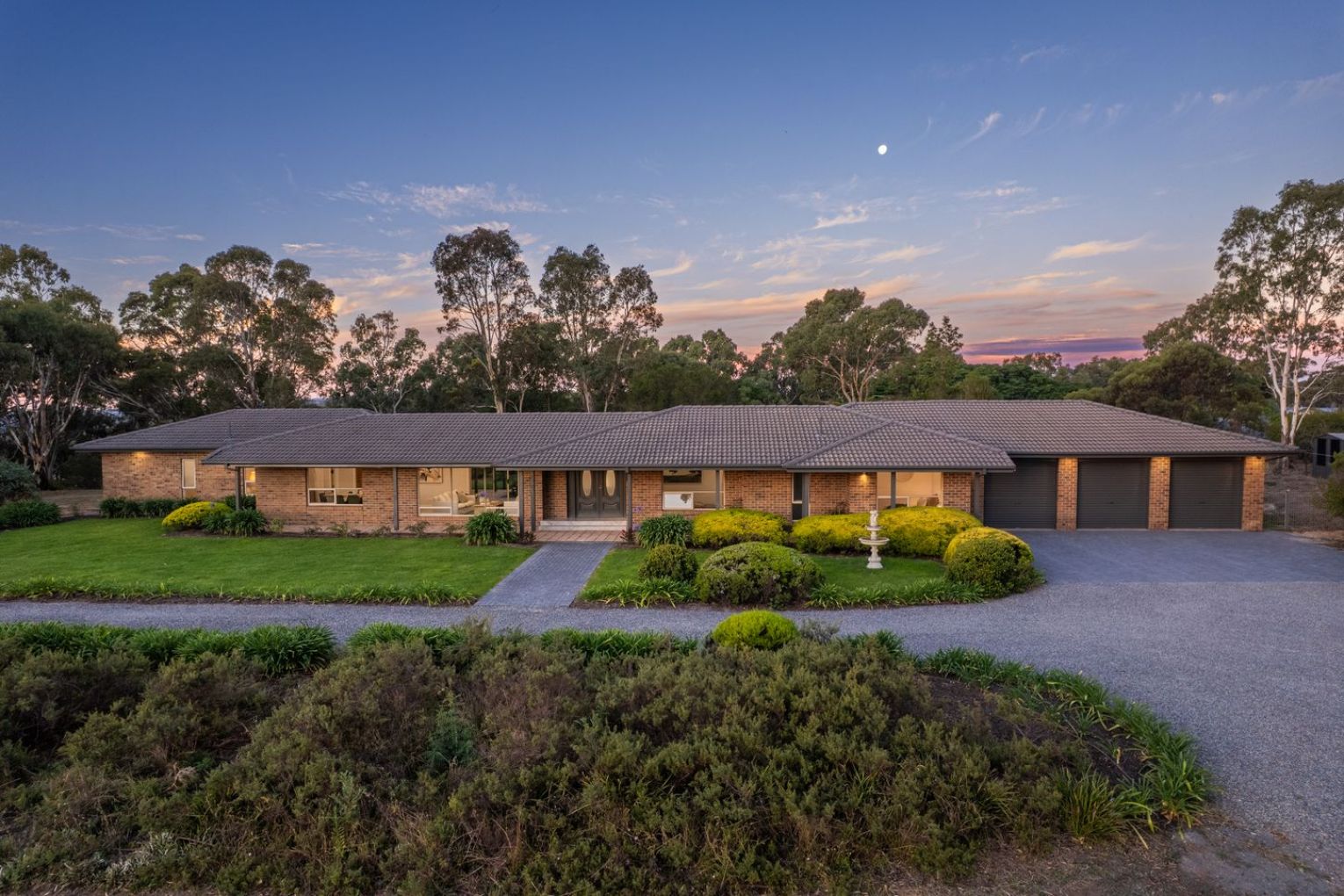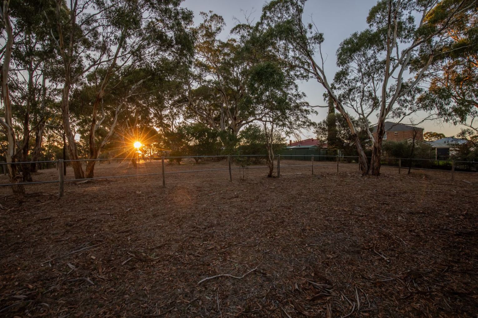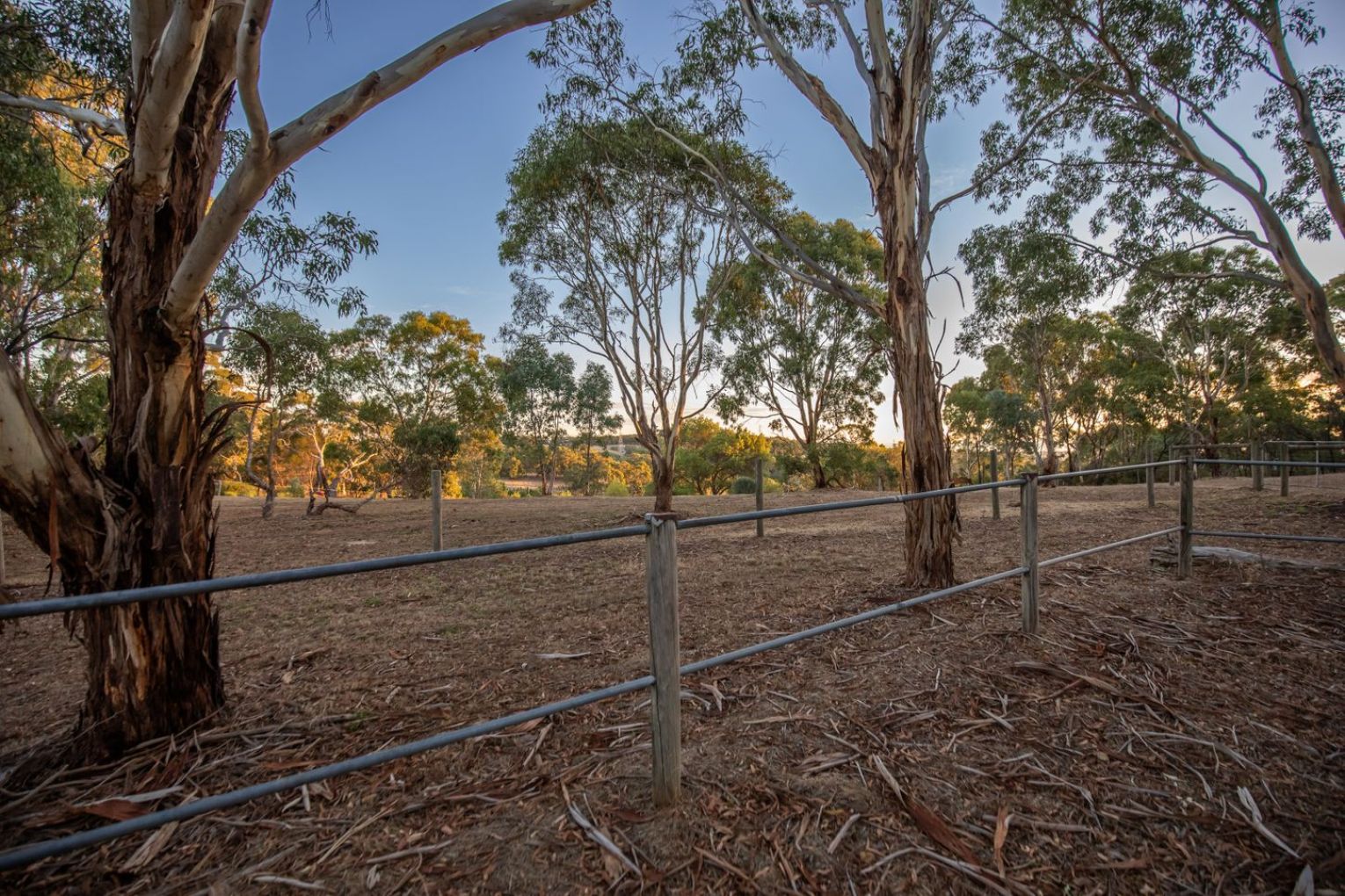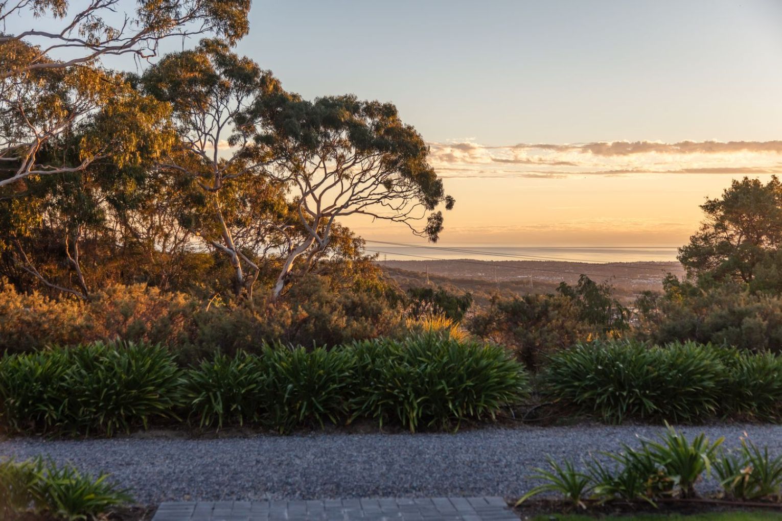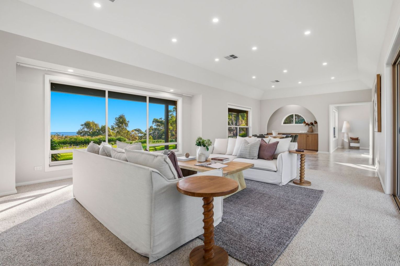 From the moment you arrive, there’s a sense of separation from the everyday. The land opens around you – gently undulating, usable, and beautifully established – while your eye is drawn outward to a horizon that stretches to the sea. By day, it’s a soft, endless blue. By night, the lights of the suburbs below flicker into life, creating a backdrop that feels both grounding and extraordinary.