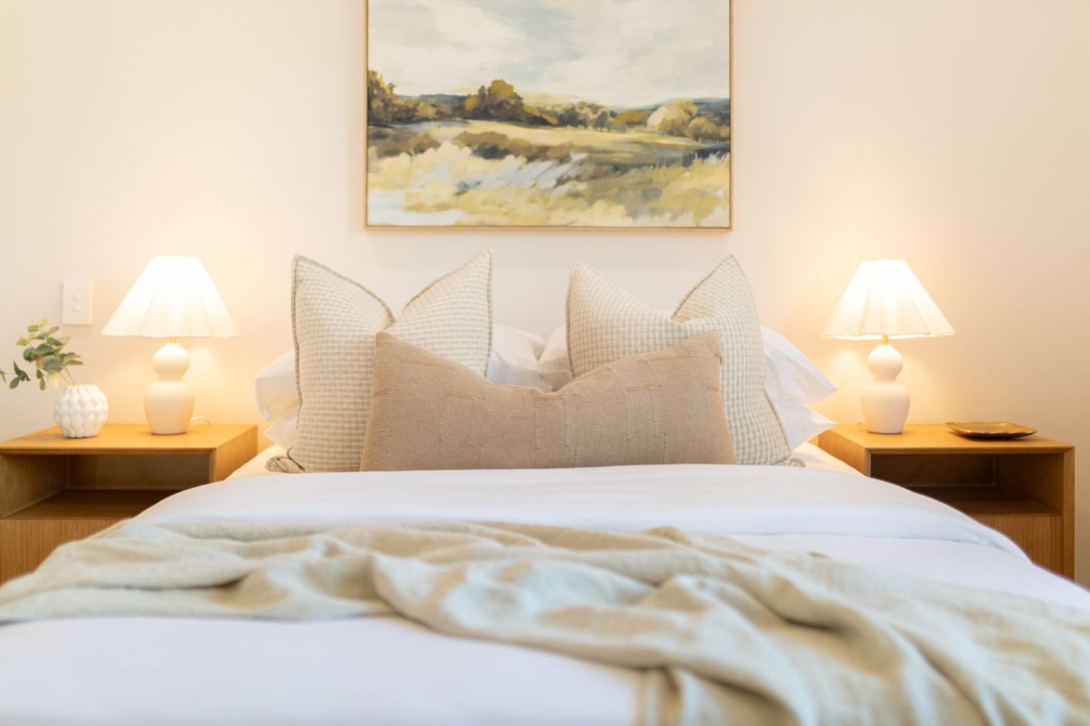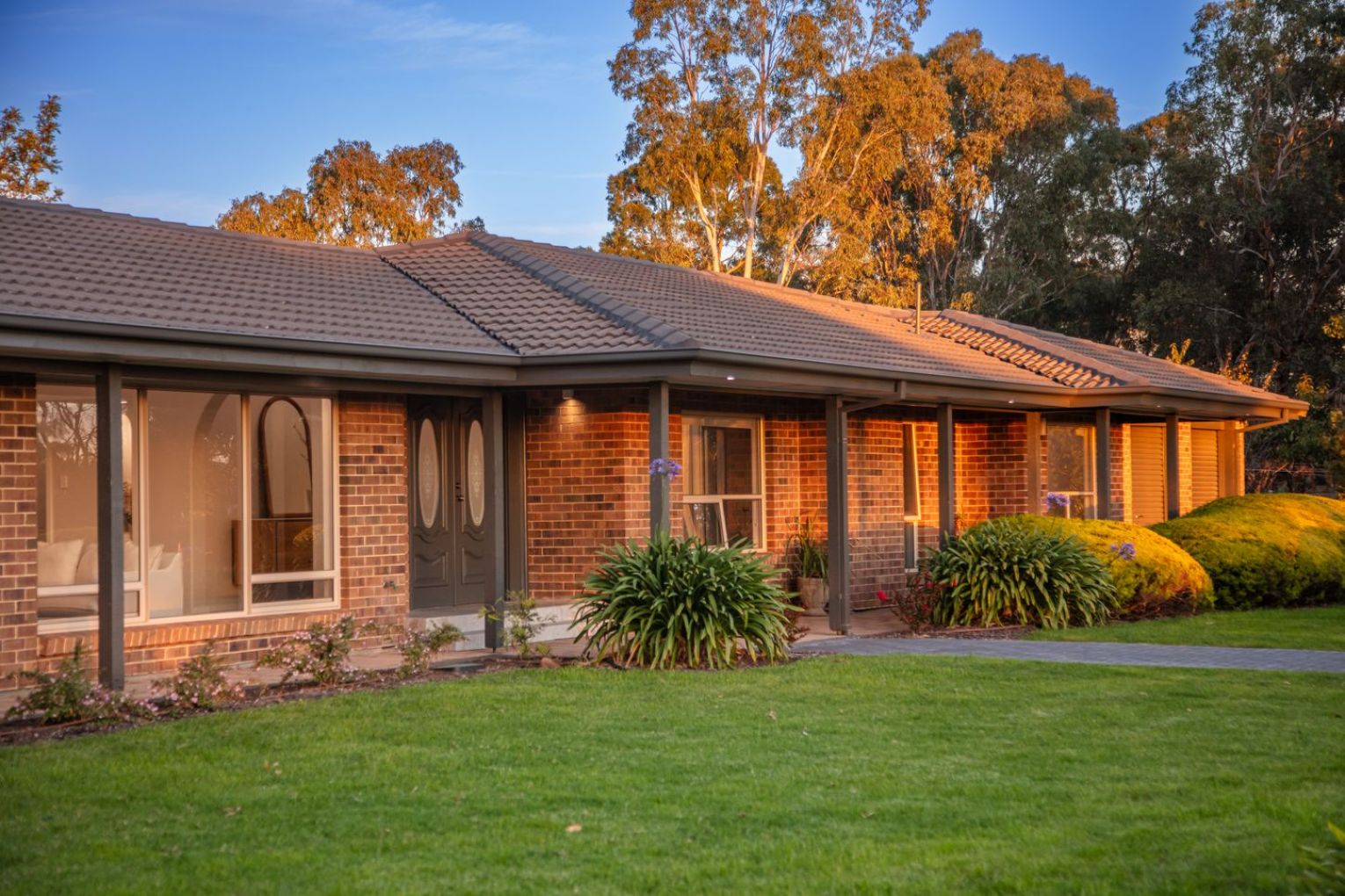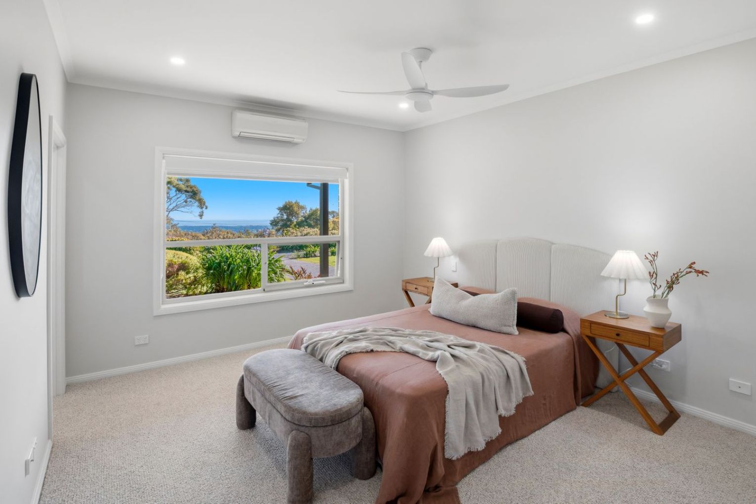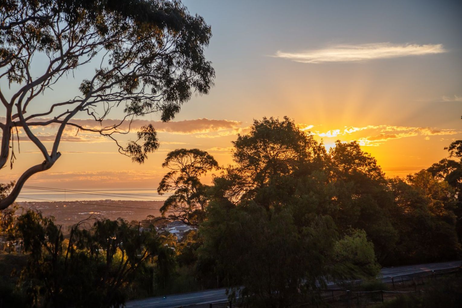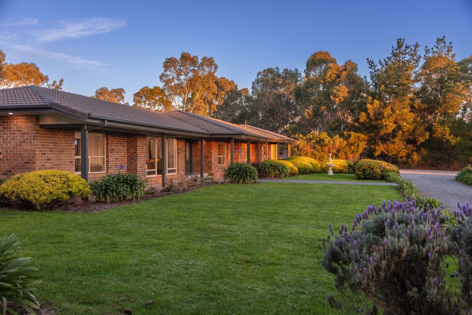 From the moment you arrive, there’s a sense of separation from the everyday. The land opens around you – gently undulating, usable, and beautifully established – while your eye is drawn outward to a horizon that stretches to the sea. By day, it’s a soft, endless blue. By night, the lights of the suburbs below flicker into life, creating a backdrop that feels both grounding and extraordinary.