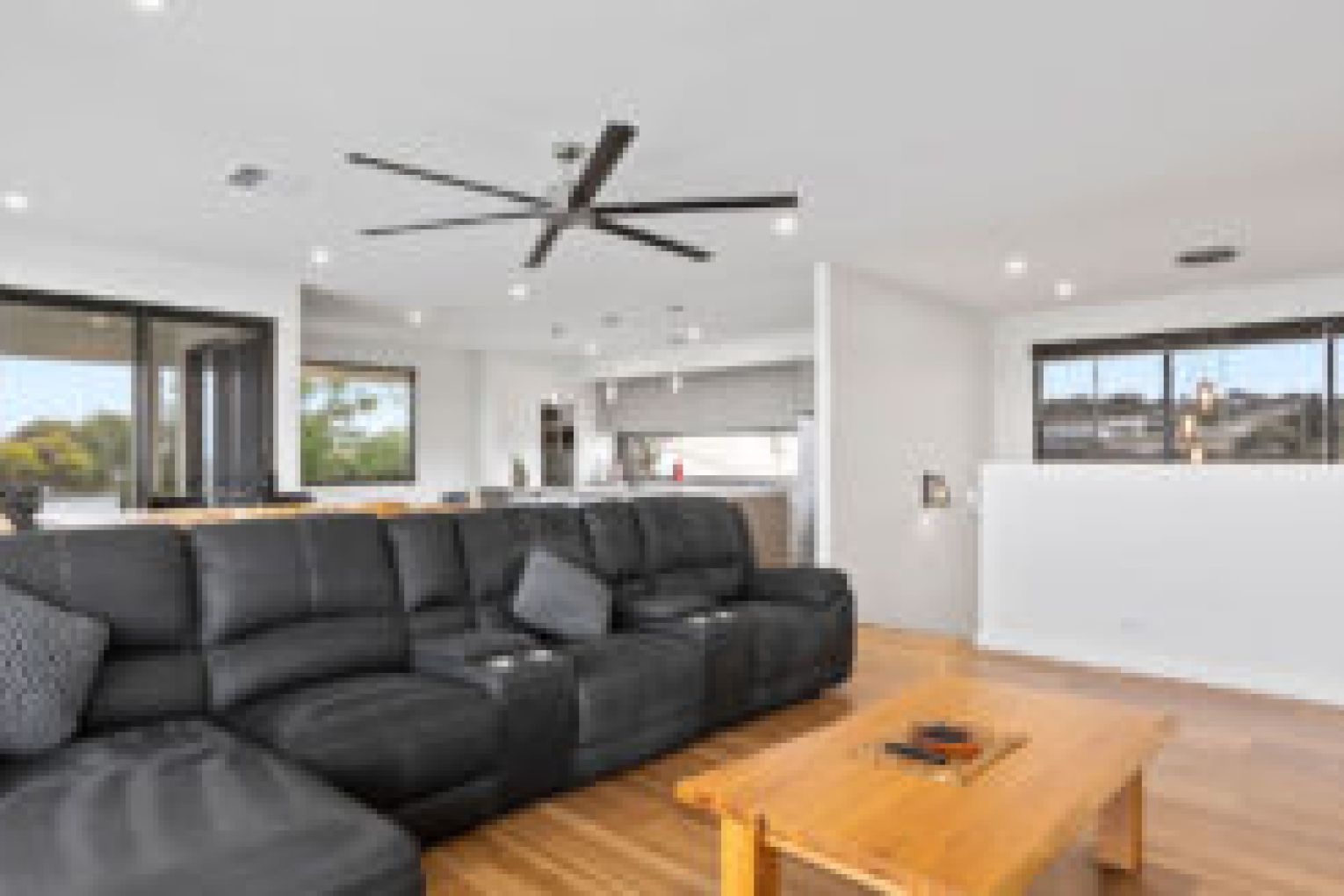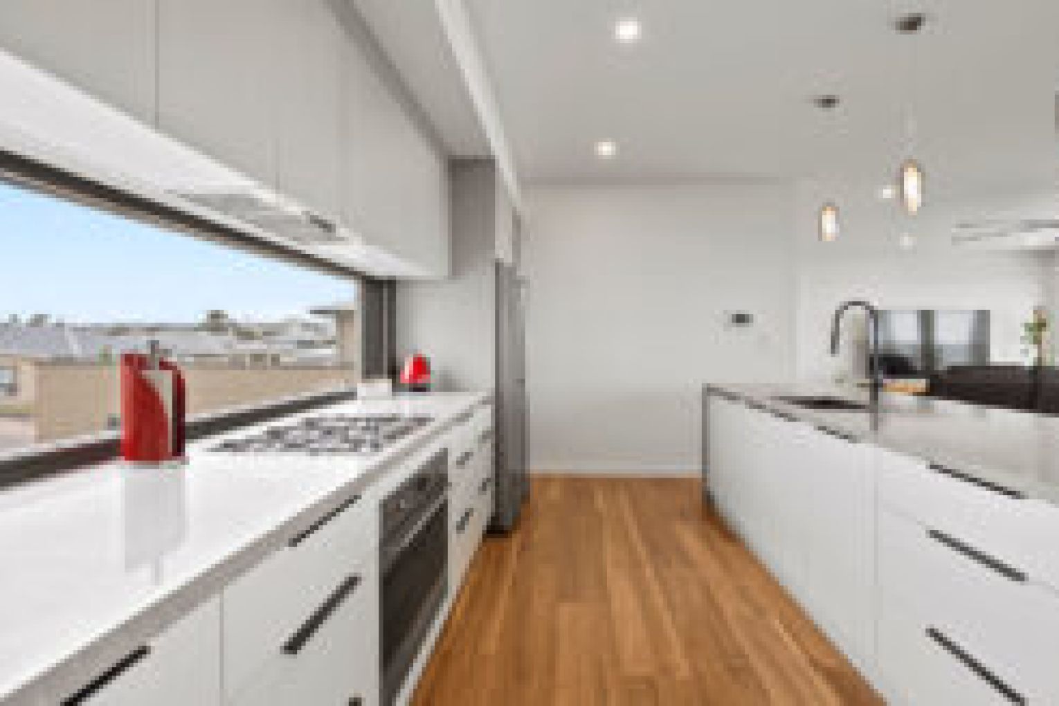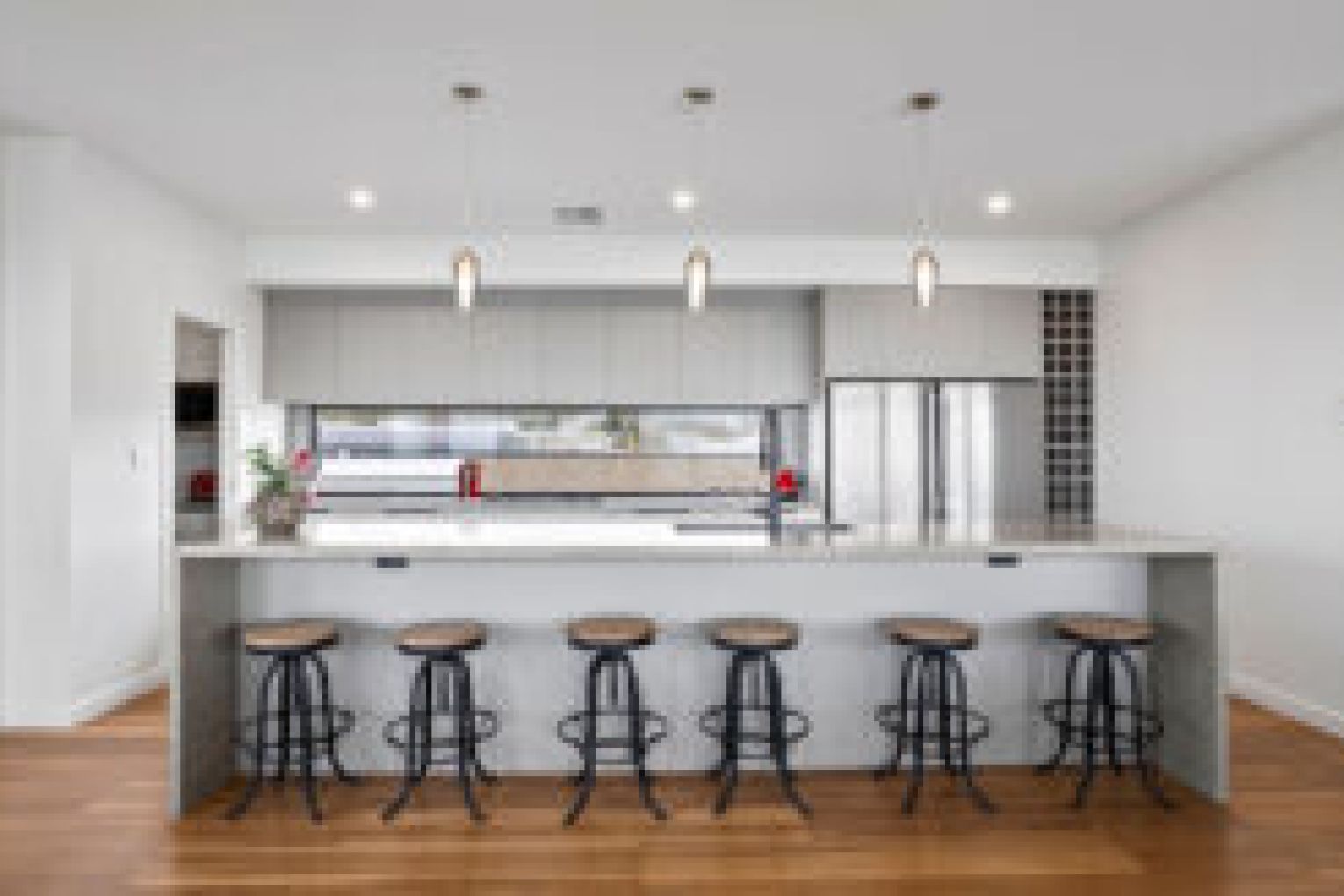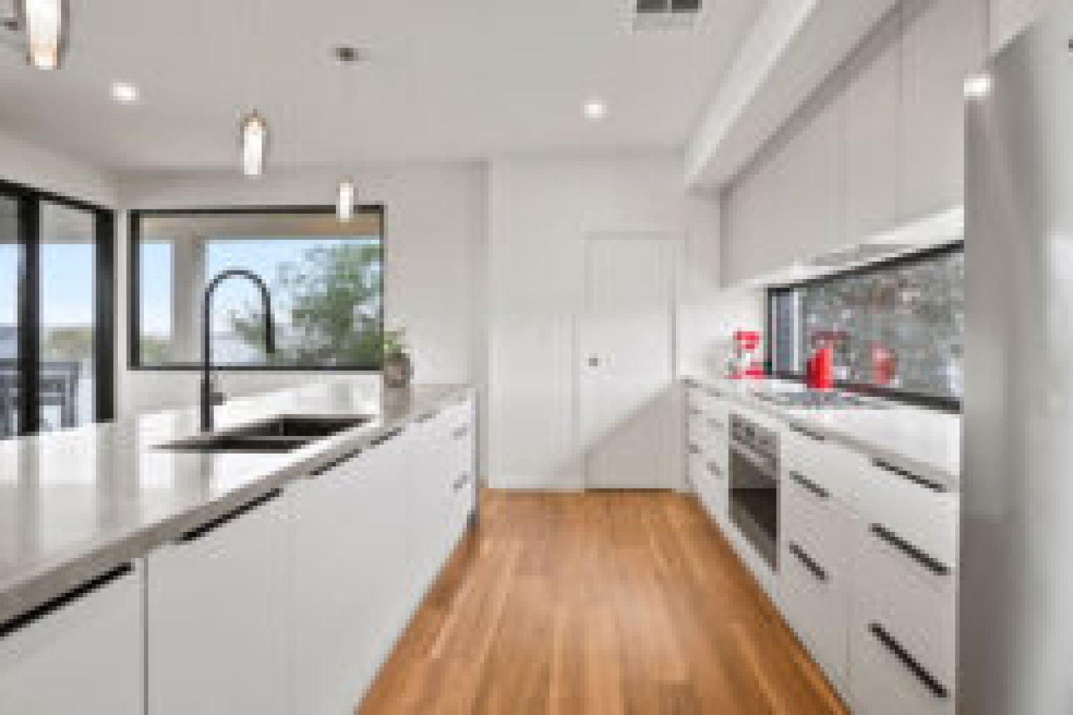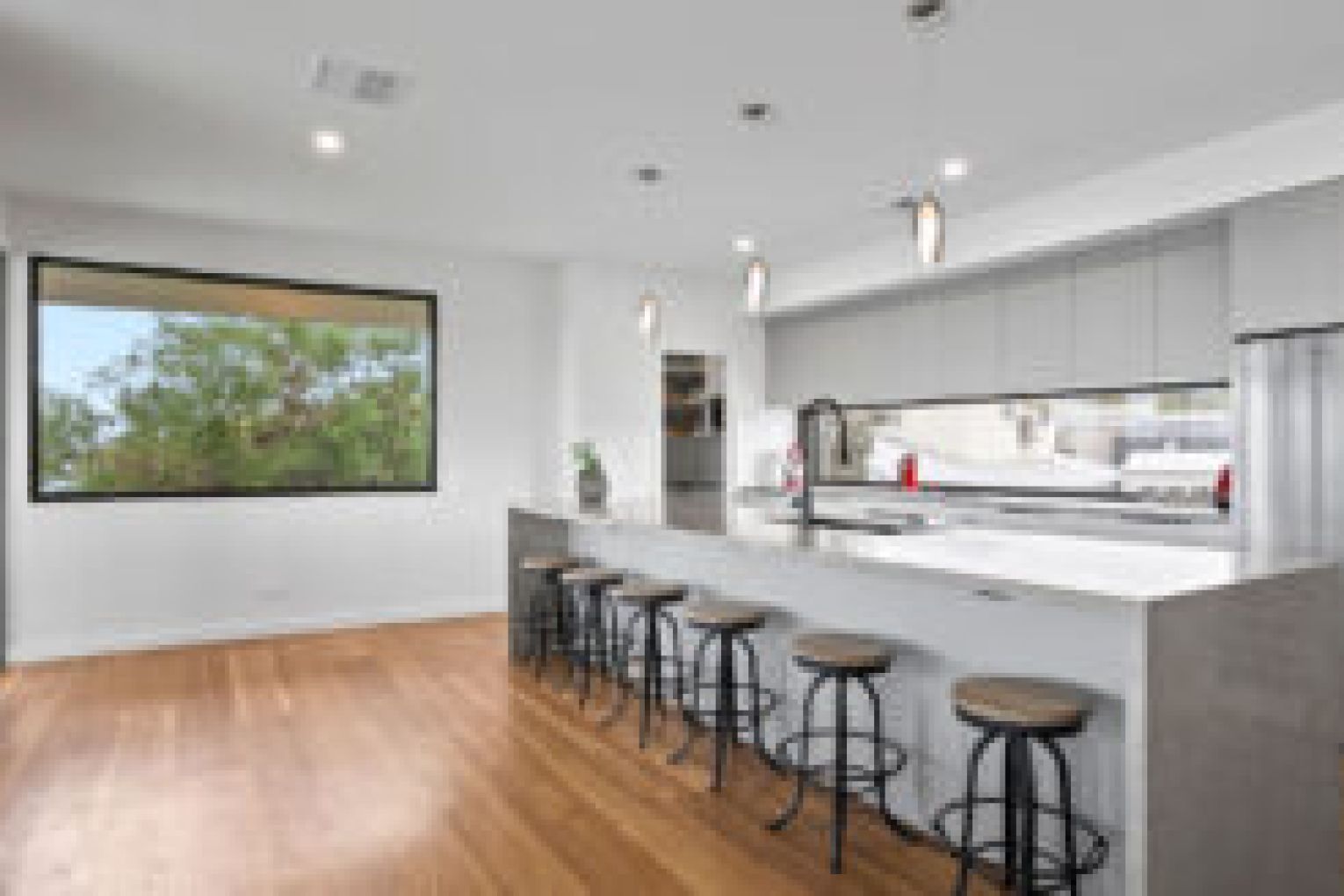 Upstairs, you’ll be greeted by breathtaking water views from almost every window, enhancing your daily life. The open-plan design effortlessly blends the living, dining and kitchen spaces into one, creating an atmosphere that’s perfect for entertaining in style. At the heart of the home lies a breathtaking kitchen with an expansive stone tops, quality appliances, walk in pantry and breakfast bar crowned by striking designer pendant lights.