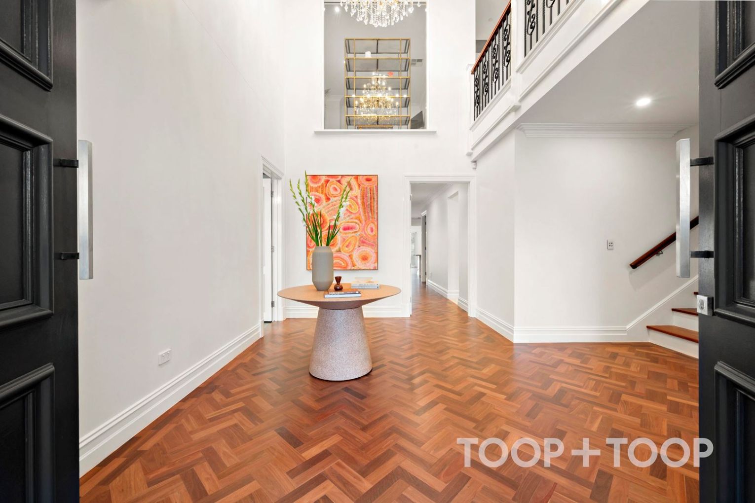 The journey begins in a wide, sunlit foyer, where polished timber floors reflect light beneath a Venetian glass chandelier. It’s a striking first impression and one that sets the tone for what lies beyond.