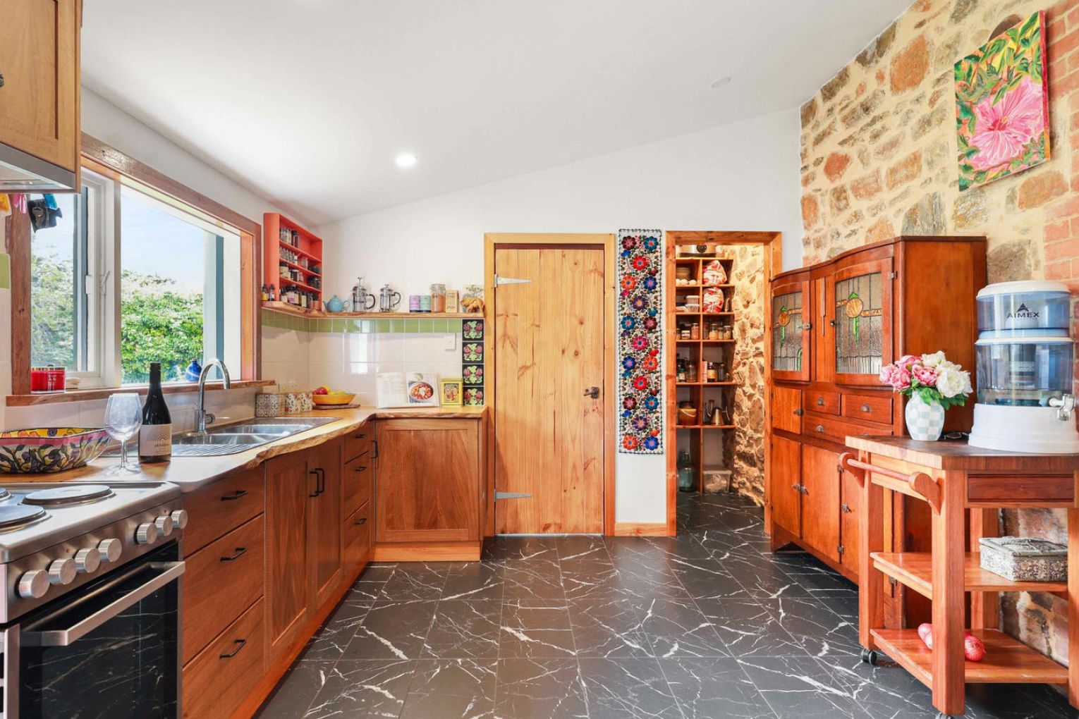 The hub of the home is located at the rear of the property with its spacious second country kitchen that features the original back stone wall, tiled floor, Sugar gum timber cupboards with soft touch drawers, Lebanese Cyprus Top, walk-in pantry, adjoining dining area and picture window overlooking over the expansive garden.