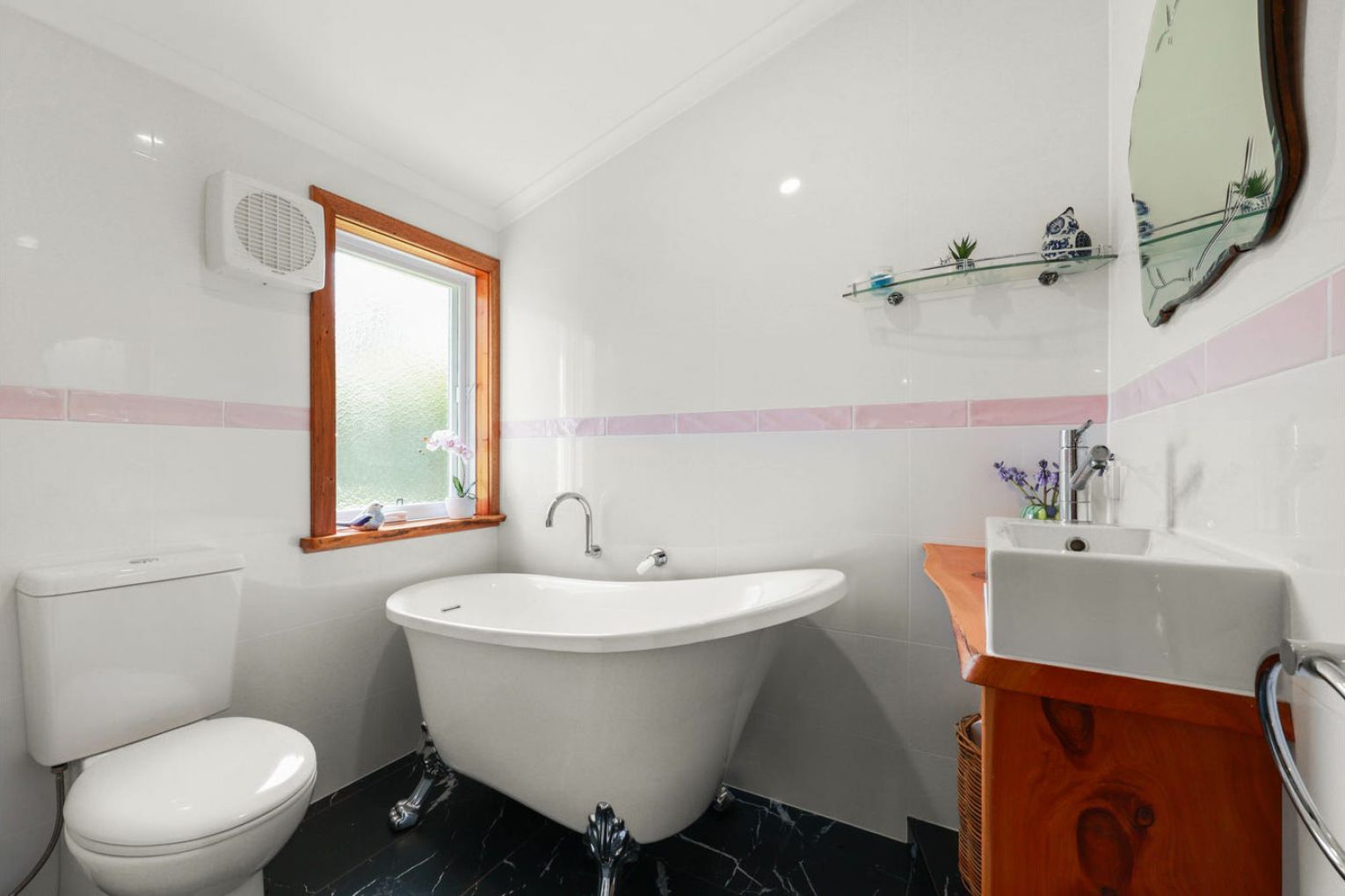 New main bathroom is bright and light with claw bathtub and shower above, plus toilet and vanity conveniently located close to main bedroom.