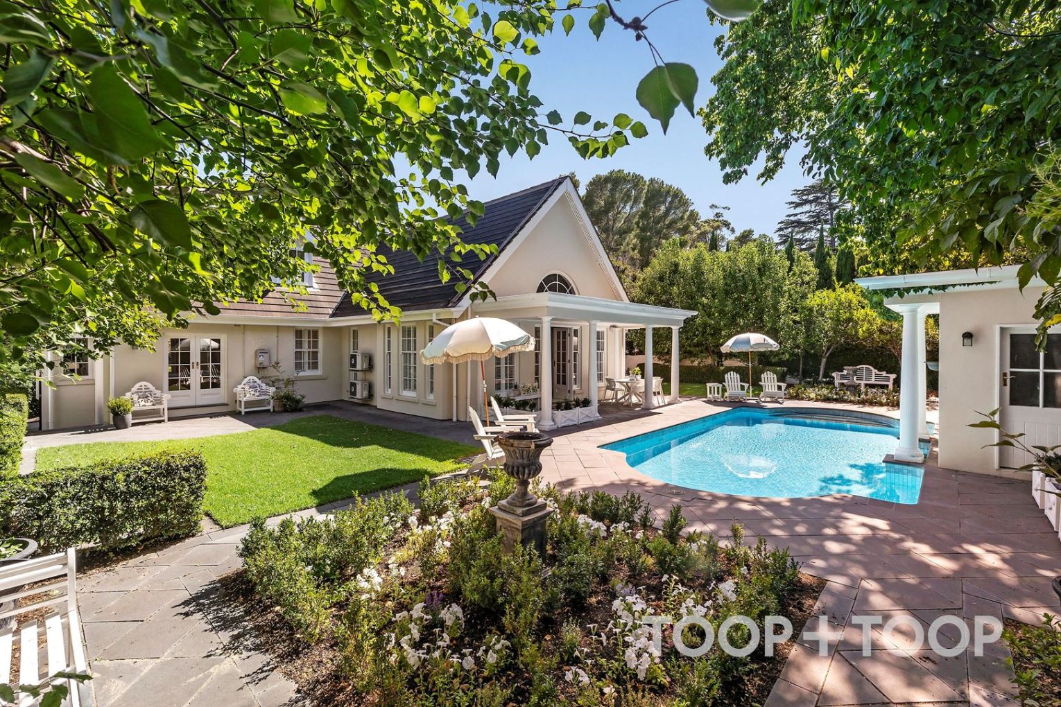 Wonderfully wide, green gardens and Manchurian Pears frame every outlook, creating a tranquil, private escape designed for quiet moments admiring local wildlife, Christmas lunches and long-lasting summers spent poolside.