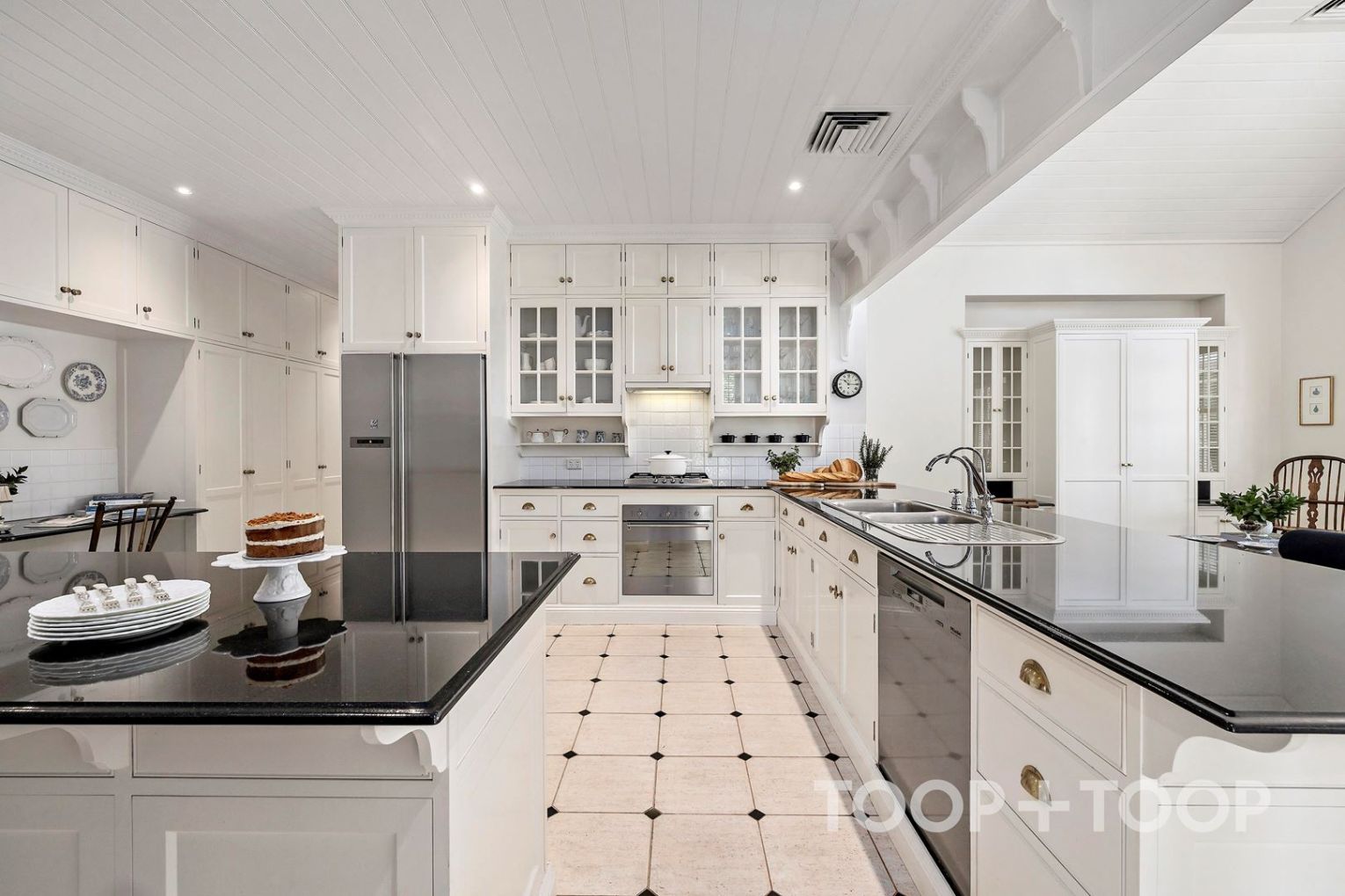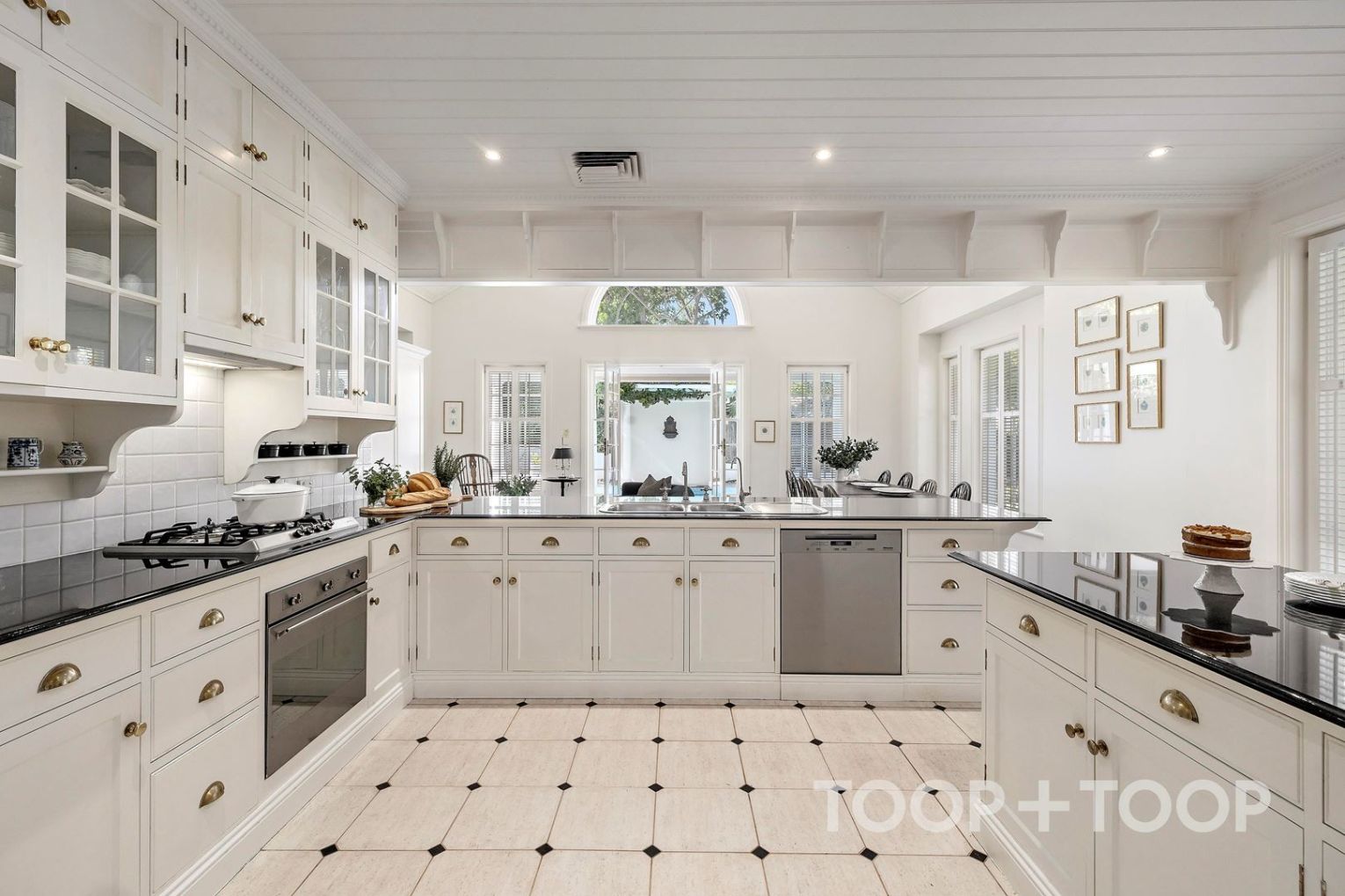 At the centre of an open-plan addition, the granite-topped kitchen acts as a gracious host with its European appliances, unencumbered island bench and seemingly endless floor-to-ceiling storage.