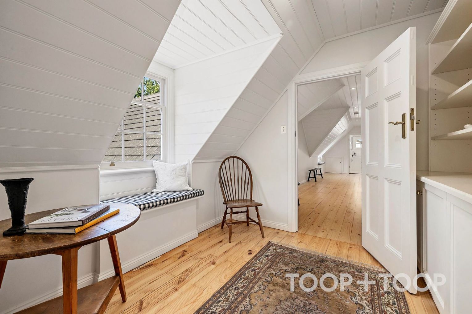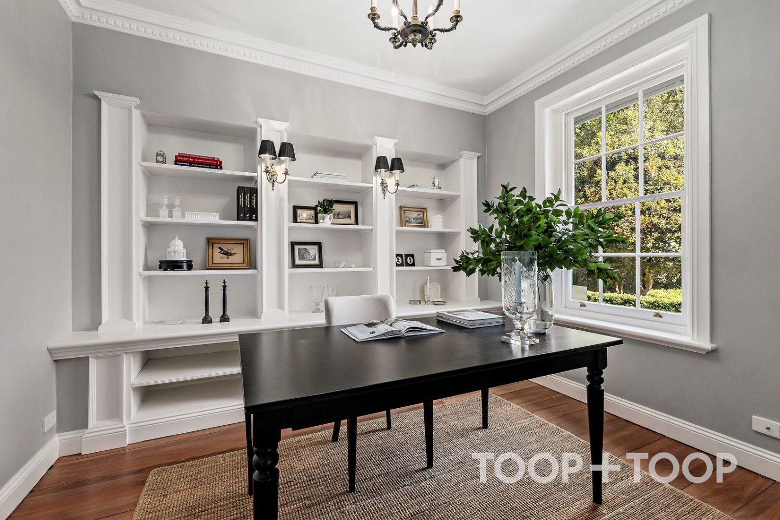 Light spills generously across every inch, beginning with a welcoming ground floor that pairs classic proportion with personal artistry, including a bespoke home office where Bill Blass–inspired shelving adds a distinctive touch, personally crafted by the current owner.