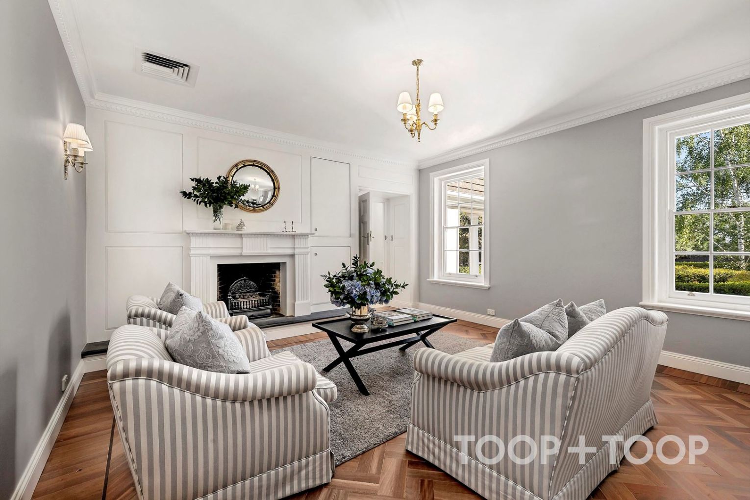 Repainted in Georgian grey to showcase Brush Box herringbone flooring, locally sourced antique light fittings and a warming gas fireplace, the sitting room is an inviting retreat made for quiet evenings, a good book and hot cup of tea.