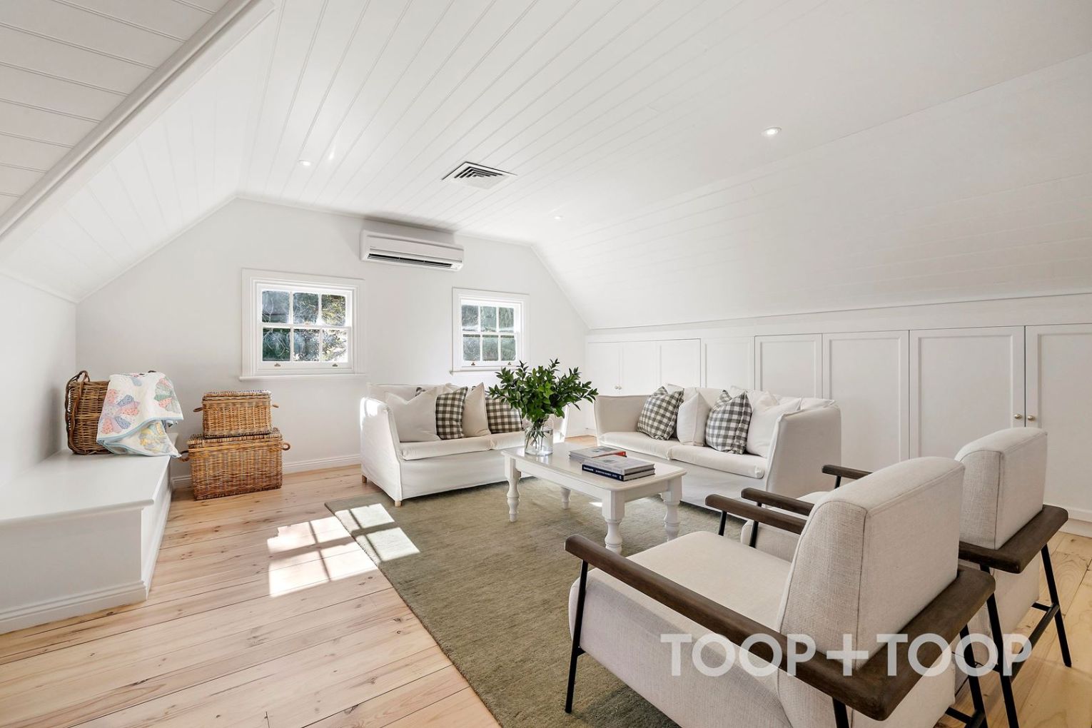 Above it all, three further bedrooms, a lounge and bathroom form a bright, air-conditioned upper level – an ideal independent domain for growing children or guests, bathed in light and city views through picture windows.