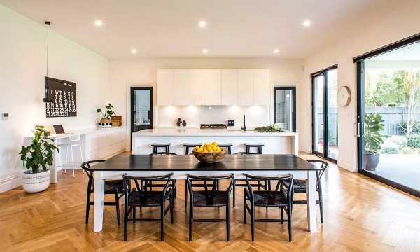 The original villa stopped short of the current home’s length. You walk over the original back step upon entry to the open plan living, dining and kitchen at the home’s rear, and a section was also added along the side of the property.