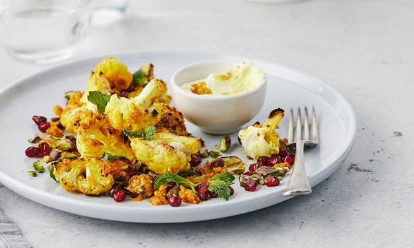 Turmeric cauliflower with lemon cream, pomegranate and pistachios