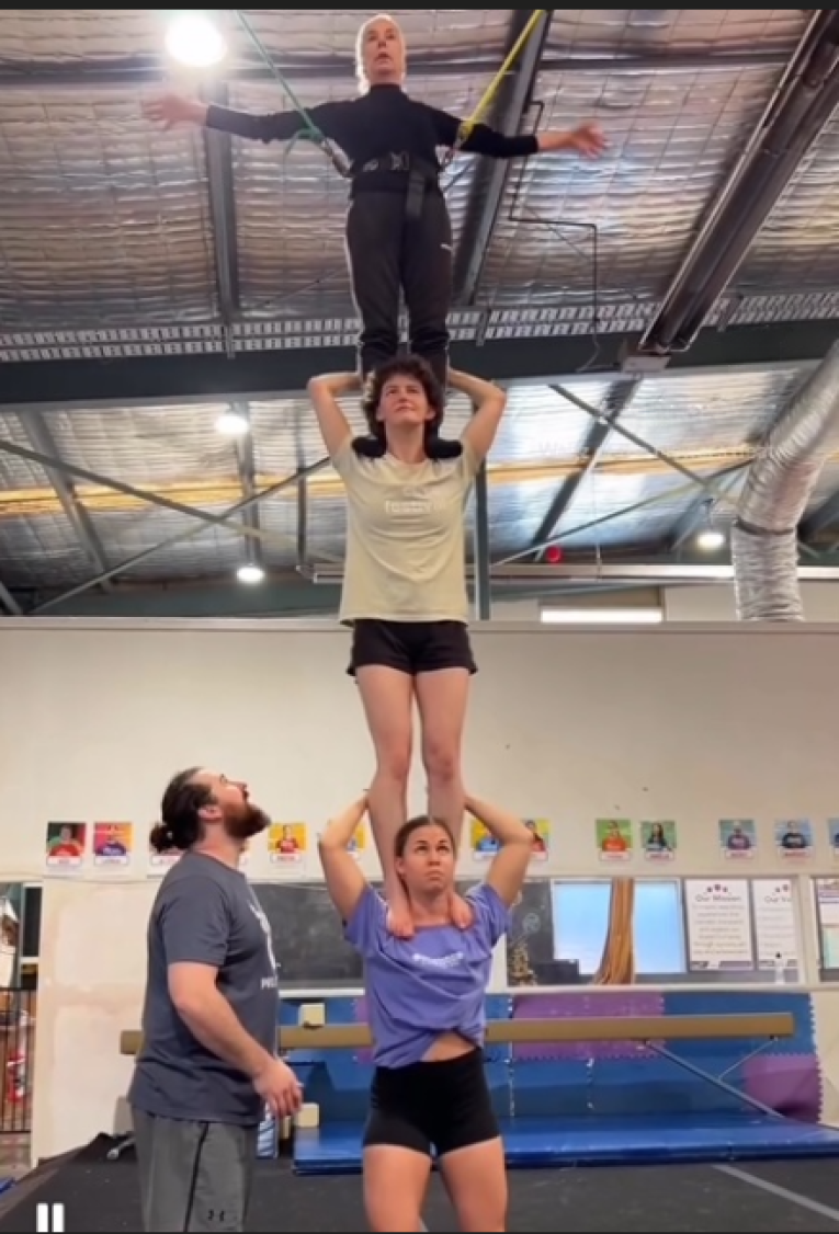 And then there are the spontaneous moments—like suddenly being called into the training space to fly a three-high (on lines, of course). For those unfamiliar, a three-high is when you’re standing on the shoulders of someone, who’s standing on the shoulders of someone else.