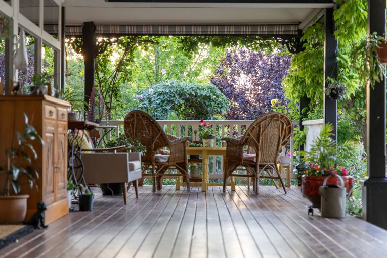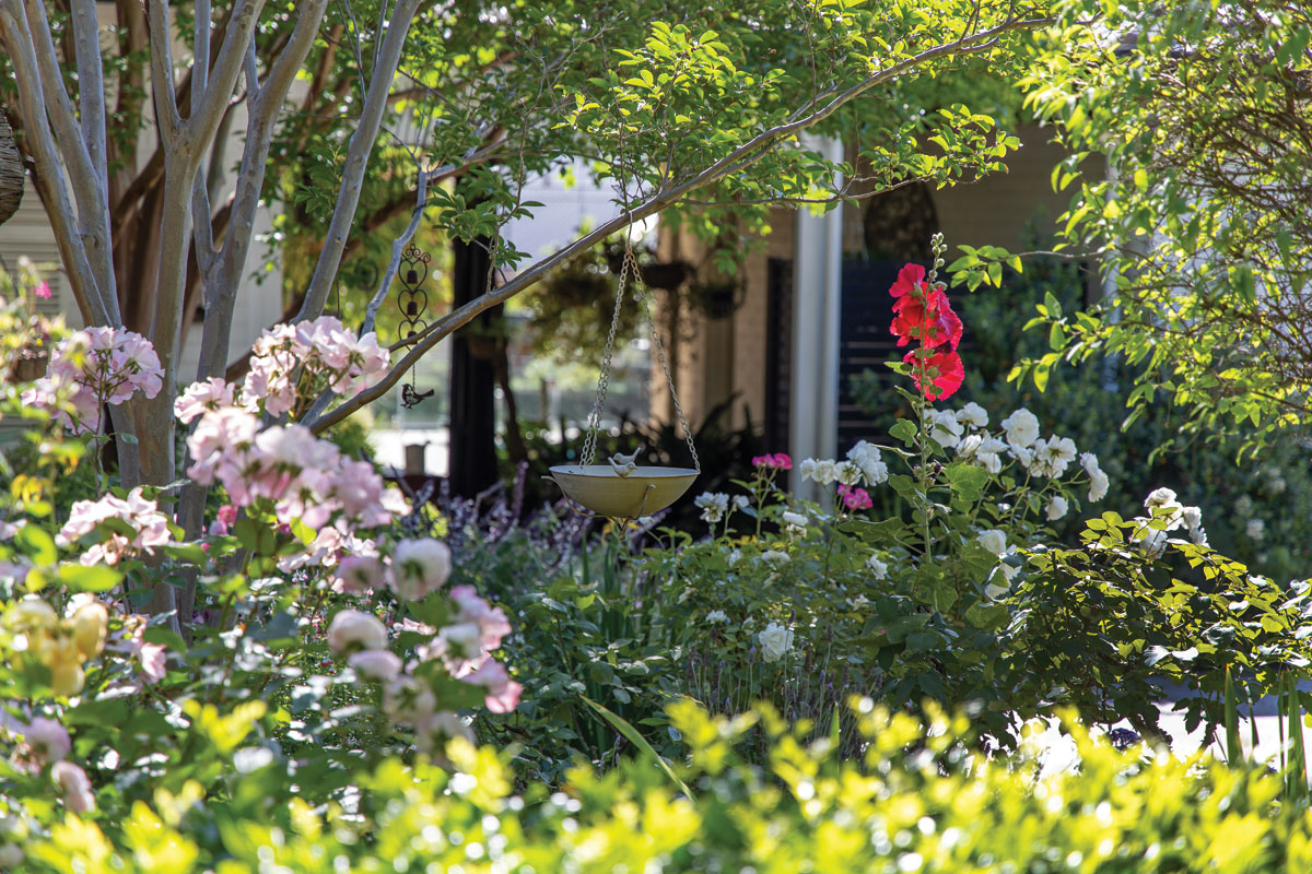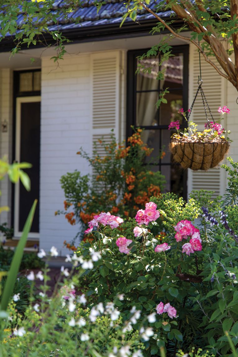 Inspired by English cottage gardens, Helen and Bill’s garden is perfect in spring when the roses bloom – there are about 150 of them. A 20-year-old weeping mulberry creates a point of interest, surrounded by a liquidambar, crepe myrtles and a maple. Garden paths wind through salvias, there’s a small orchard out the front and a wisteria wraps around the home.