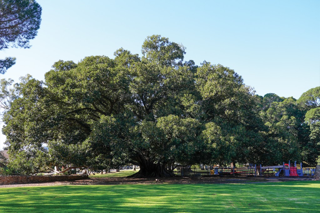 The City of Campbelltown also has many special Moreton Bay Figs. One will be found in Gurner’s Reserve in Rostrevor, a public park adjacent Fourth Creek, which was originally a larger parcel of land purchased in 1838 by Charles Sturt, who built a home and planted many trees, including, it is believed, this imposing specimen. Many generations of families have enjoyed its broad canopy and buttressed roots.