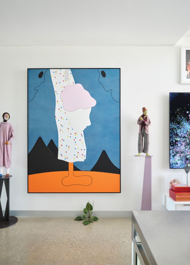 The main painting in the living room is by Brent Harris, framed by statues by Francis Upritchard.