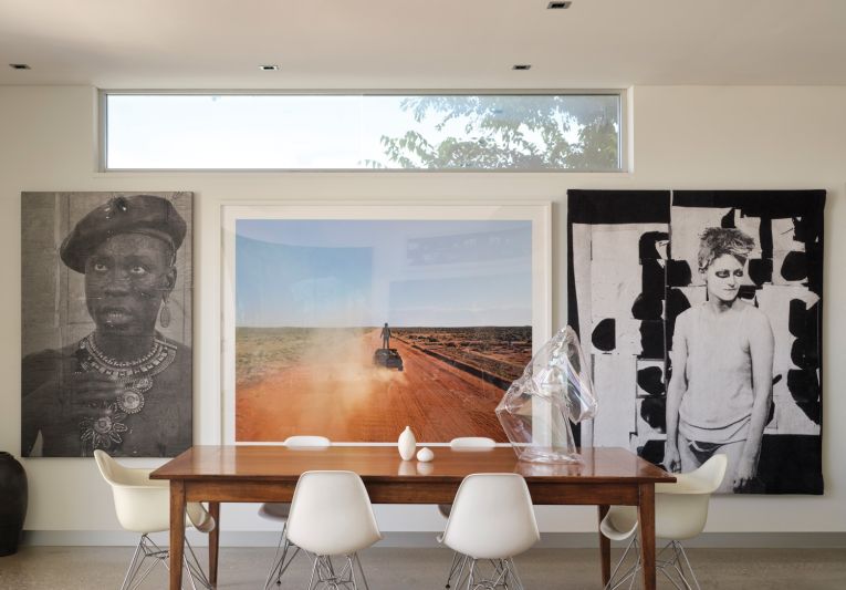 Her own favourite hang within the Groses’ extensive collection creates a dramatic backdrop behind the dining room table. It features a Shaun Gladwell photograph of a figure standing on a car driving along a red dirt road in the outback (from his 2009 video work Interceptor Surf Sequence) flanked by two large works by Brook Andrew and David Noonan.