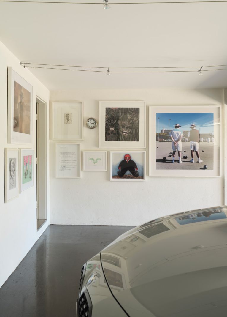 The stunning salon hang in the garage includes works by Mike Parr, Peter Liversidge, Fiona Hall and Selina Ou.