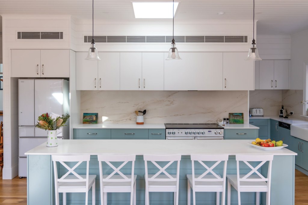 Today’s extension holds the living and dining spaces, as well as a duck egg blue kitchen beneath a soaring pitched ceiling with skylights. The tongue and groove walls and ceiling inject texture among the country farmhouse styling, which includes traditional shaker-style sinks and glass bell-shaped pendant lights above the generous kitchen island.