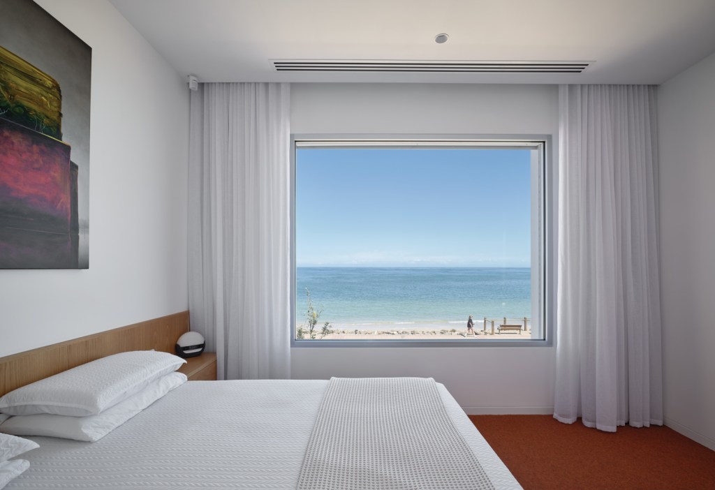 The mid-century-inspired design is the only single-storey new build along the coastal stretch, featuring low horizontal lines, expansive glass windows and a playful pop of yellow on the soffit.