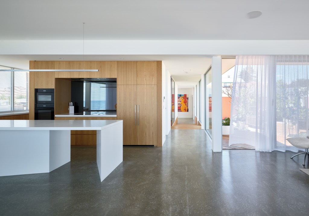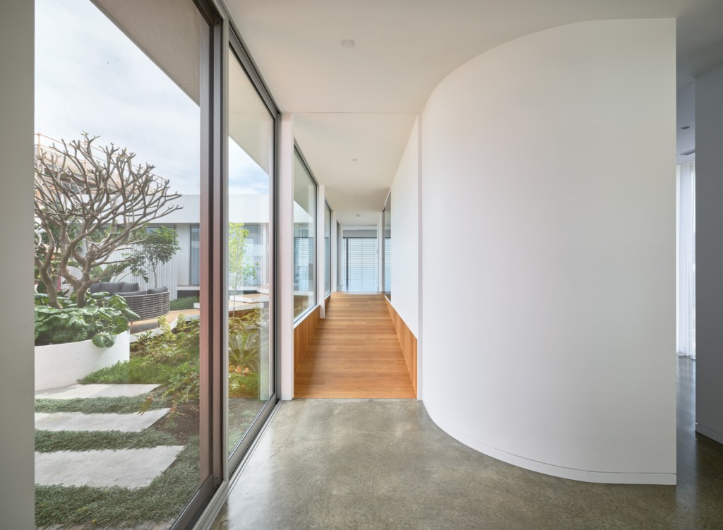 The ramp – another seemingly simple, yet intricate piece of architecture – leads the eye to striking panoramic views of the ocean. “When it gets really rough out there, if you walk up the ramp, it almost feels like you’re on a boat adrift,” Gary says. “There’s nobody walking along; there’s no boats at sea – we’re able to turn our attention to the courtyard space.”