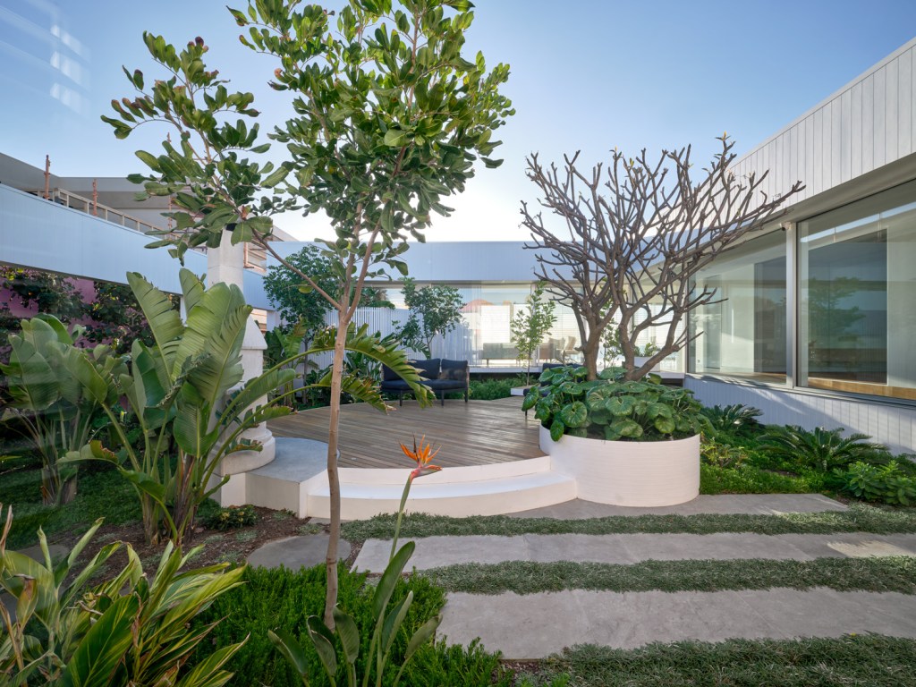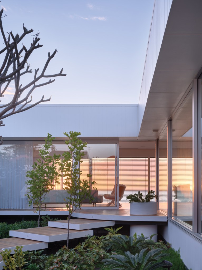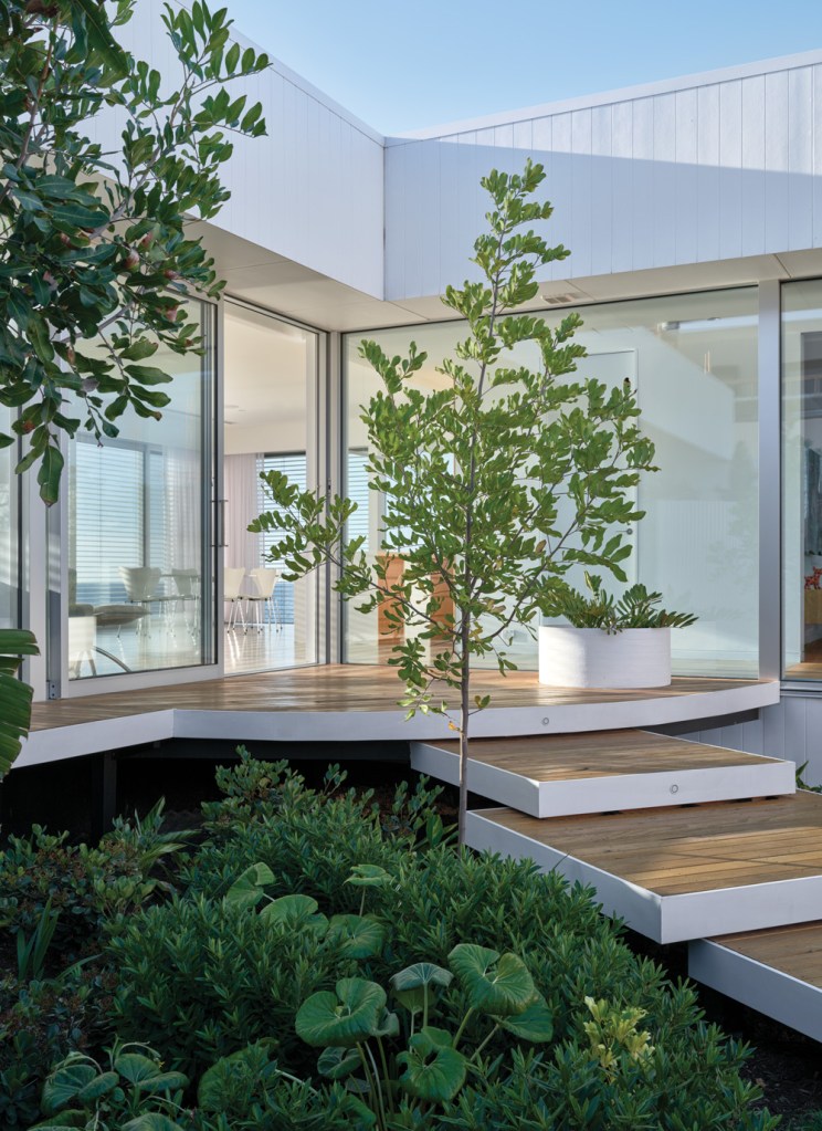 This entrance, together with a chic timber ramp that leads up to the open living area, hugs an enclosed courtyard – a peaceful, tropical-look sanctuary, protected from coastal elements.