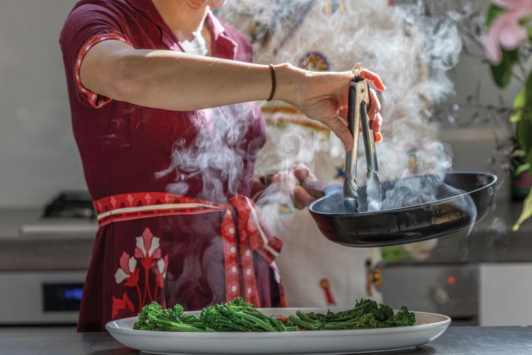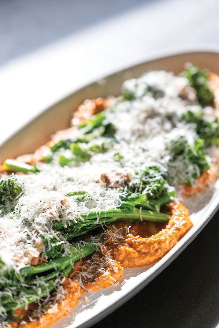 In the oven, Jels warms some already-roasted salt and vinegar potatoes, inspired by a dish at 2KW, which is one of Sinead’s favourites. For some greenery, there’s a wedge salad with romaine lettuce and crispy chilli, and charred broccolini with a romesco sauce inspired by a dish at Coccobello. To finish, Jels has made a blood orange syrup almond cake, inspired by the whole orange cake recipe from Recipe Tin Eats.