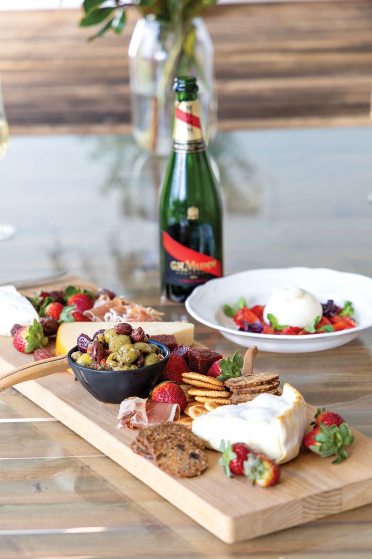 Sinead has put together a grazing board, and Jels has plated a burrata with blood orange from Sinead’s family farm, which guests enjoy outside with a glass of Champagne, crowded around the converted shearing table from the farm, which is more than 100 years old.
