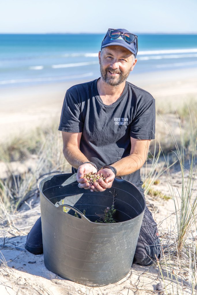 Traipsing through the dense scrub high in the dunes above Long Beach is where SALIFE finds Maris Biezaitis, the founder of Robe Town Brewery. On this sunny morning, Maris and two of his staff are out foraging for muntries – aka emu apples or native cranberries – that form a key ingredient in one of Maris’s brews: a sour beer called The Little Wild Muntrie.