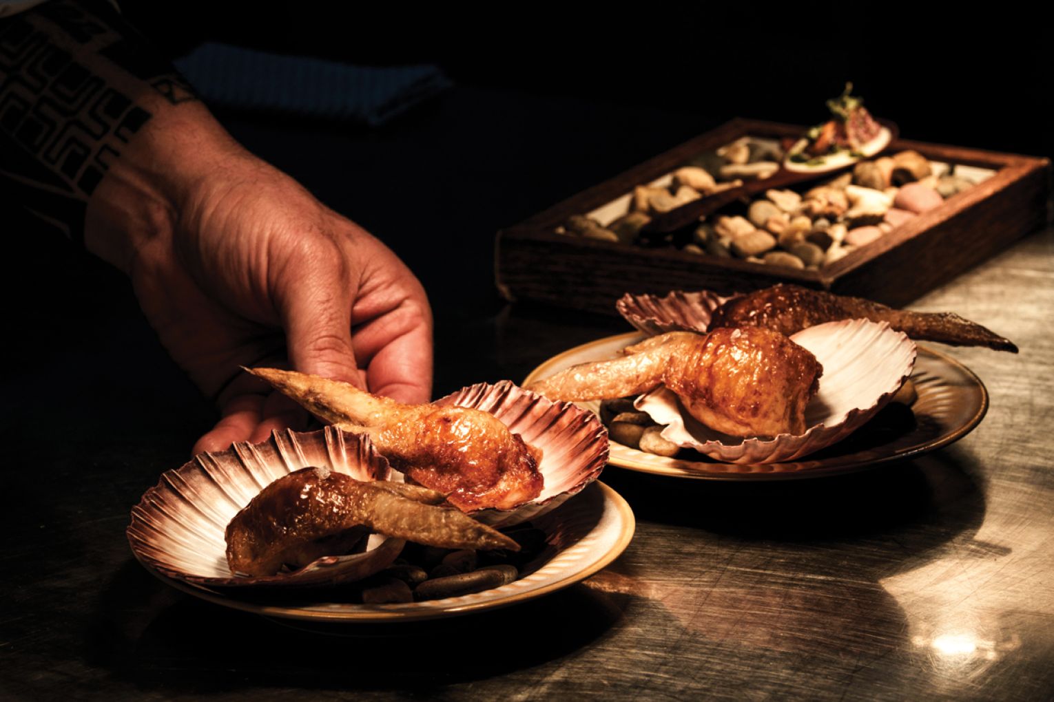 Five more petite plates arrive simultaneously for us to graze, though it’s suggested we approach them warm-to-cold. They range from the crowd-favourite deboned chicken wing stuffed with lobster and scallop, brushed with a thickened “dumpling sauce”, right through to an oyster with smoked Jerusalem artichoke foam. A chicken skin tartlet would benefit from a touch more seasoning, but appropriately carries the heat of a horseradish cream.