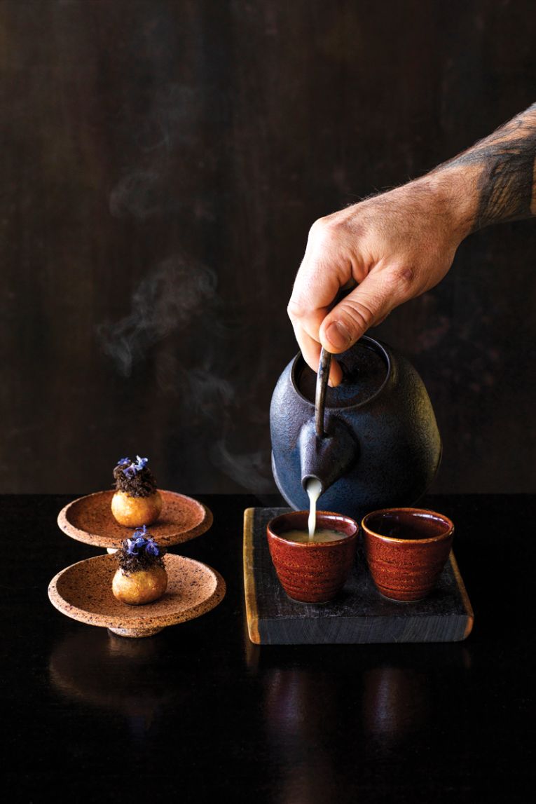 That chill is felt in the dining room, the wintry rain setting in now. Things take a moment to settle: an incorrect drink poured at the table causing confusion and delay with our own drinks ordering. Before we know it, the degustation begins with a steady stream of bite-sized “snacks”, which demonstrate the passion and technique of Huggins and his team. There’s a bit of fun, a bit of foam, and a healthy dose of smoke.