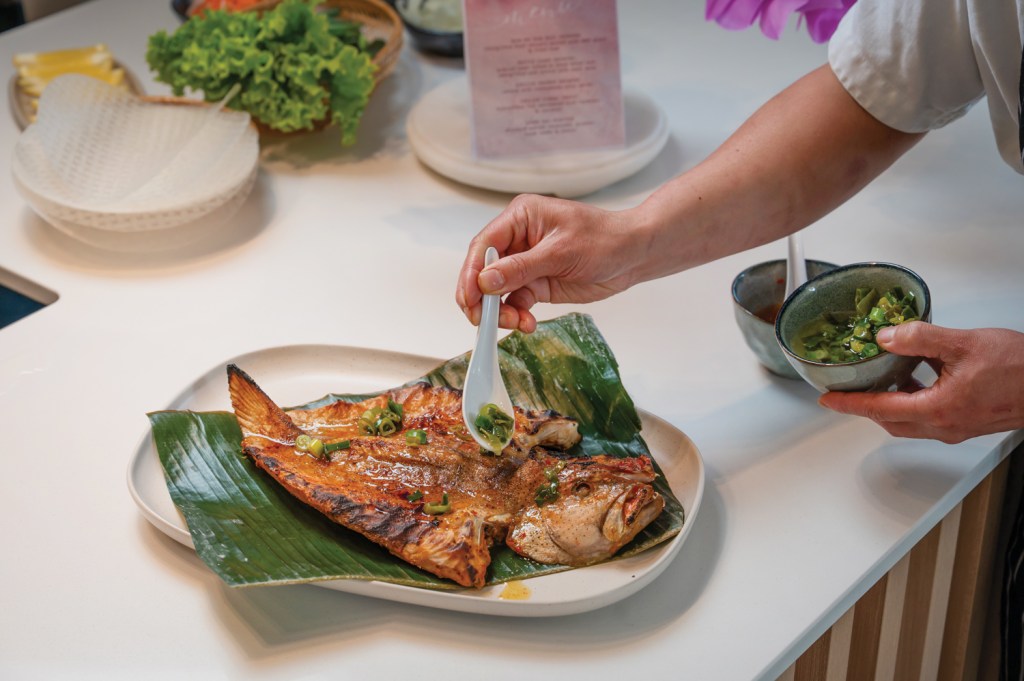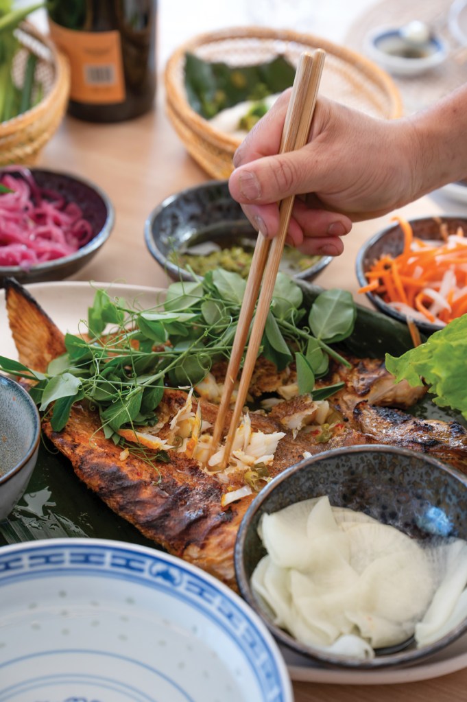 Back in Phong and Nhi’s contemporary home kitchen in Prospect, Quang dresses his burnished fish with spring onion “salsa verde”. Nhi places it atop a giant lazy Susan on the table, along with a platter of three types of skewers – bun bo hue beef, beetle lamb and prawn – baskets of banh hoi (steamed netted vermicelli), leafy greens and herbs, and dipping bowls of pickles and sauces. It’s cooking that’s equally authentic and enticing, the zesty aromas beginning to weave through conversation.