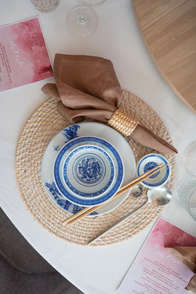 Today’s table is set with classic blue and white Chinese-style plates and bowls, and chopsticks.