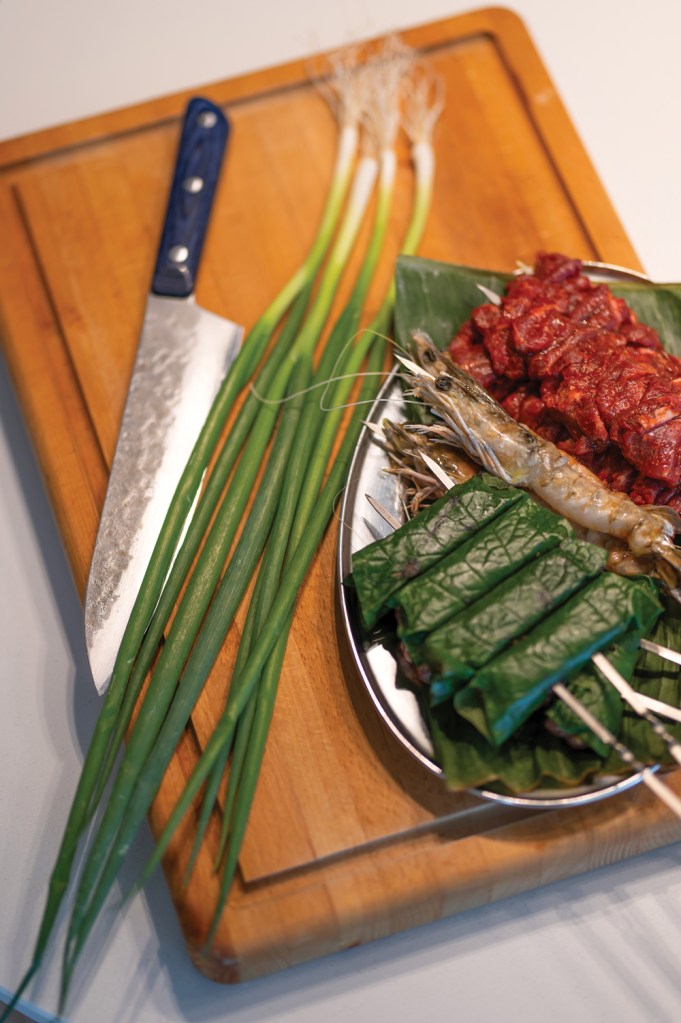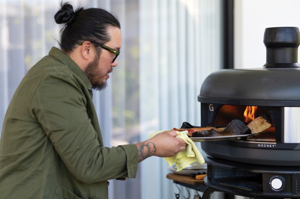 Quang Nguyen grills skewers of betel leaf-wrapped lamb on a sizzling hibachi grill, while a Gozney Arc oven – his new toy – fires up beside him. That’s where he’ll cook a whole butterflied coral trout – the showpiece of today’s family lunch.