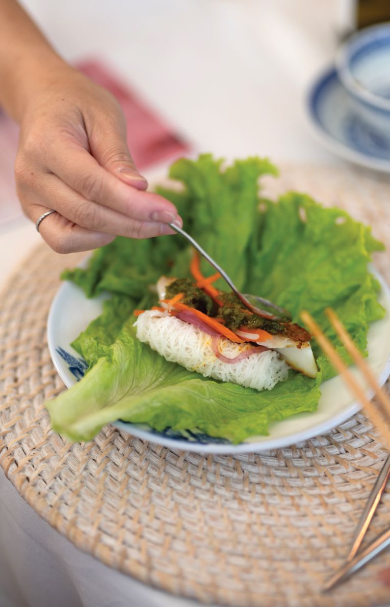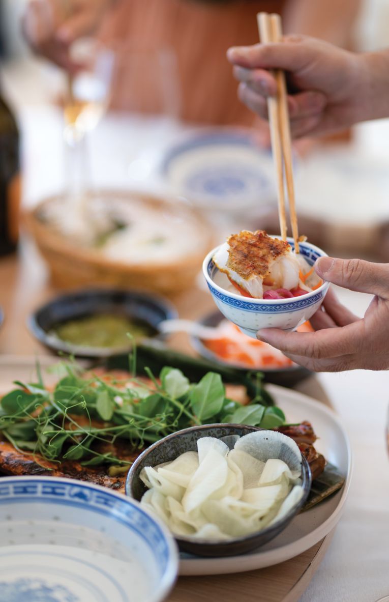“With the bowls, the little one is for sauces or saucing, and often the bigger plate is for the rice paper, and you put everything on top,” Nhi explains. “Carbs, pickles, fresh herbs – then you add the protein on top.” The “green sauce”, she says, is for seafood, while the chilli-laced nuoc mam is for “everything else”.