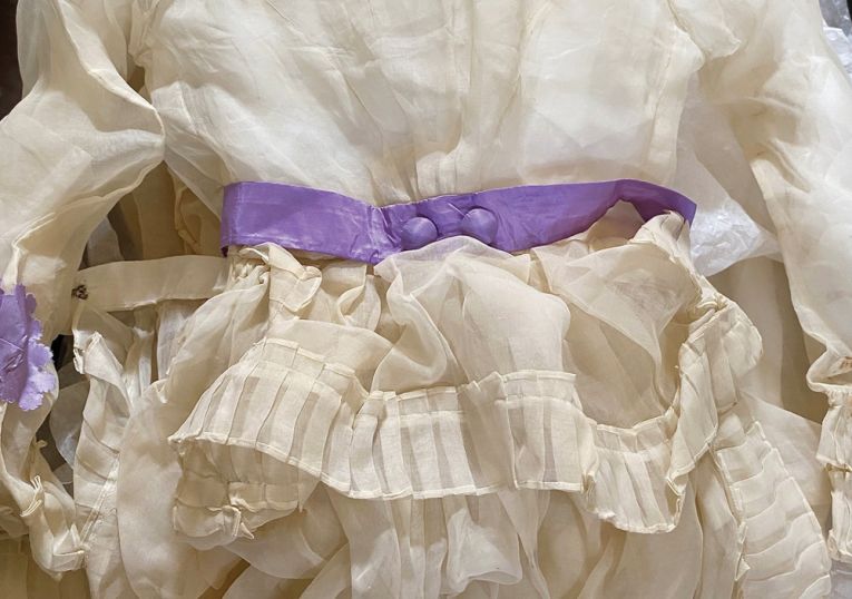 “I remember opening it, pulling back the tissue paper to see an 1860s or 1870s dress,” she says. “It was made from the most sheer cream silk organza, and it had these purple bows and ruffled details. It was absolutely incredible, with little pleats along the hems. It was so exciting.