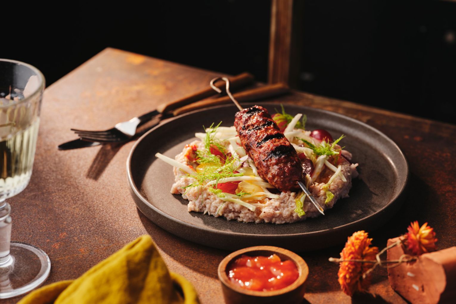 Spread almond skordalia on a plate. Sprinkle across the fennel and grape salad, before placing sausage on top. Serve with chilli oil and tomato relish on the side for extra flavour.
