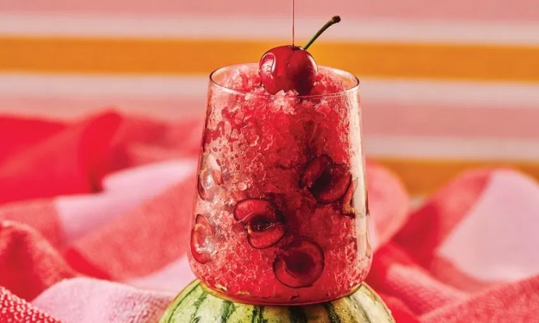Quench your thirst over a warm weekend with this watermelon, sparkling rosé and cherry shaved ice – a grown-up spin on a fun childhood treat.