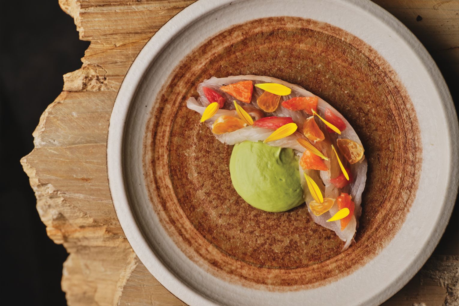 To plate, pipe avocado cream just left of centre on the plate. Dip the whiting into the juice, then drape to the right-hand side of the avocado on the plate. Season with flake salt, garnish with the citrus pieces and calendula petals.