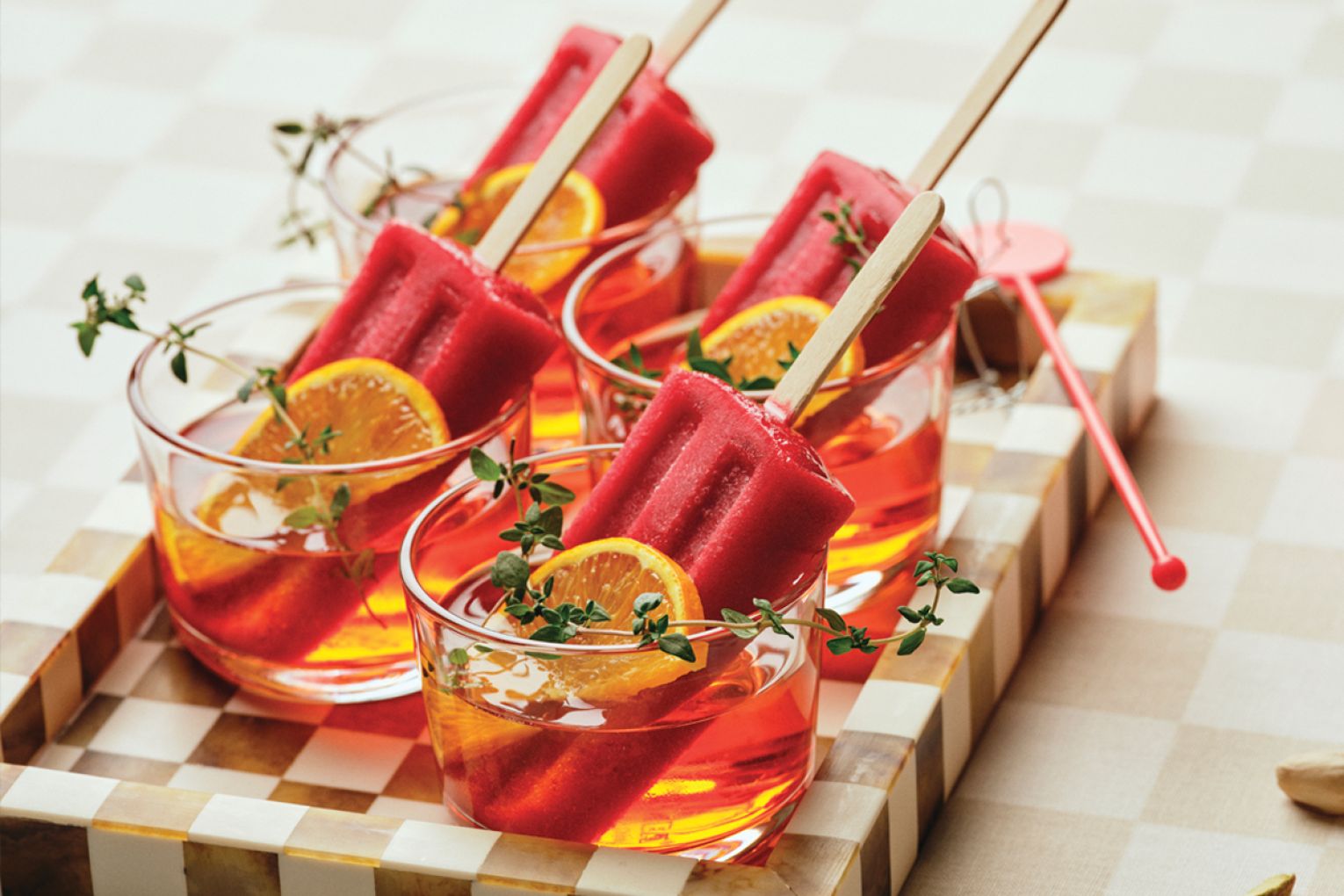 To serve, divide Aperol between glasses, add popsicles, garnish with orange and thyme and top with prosecco.