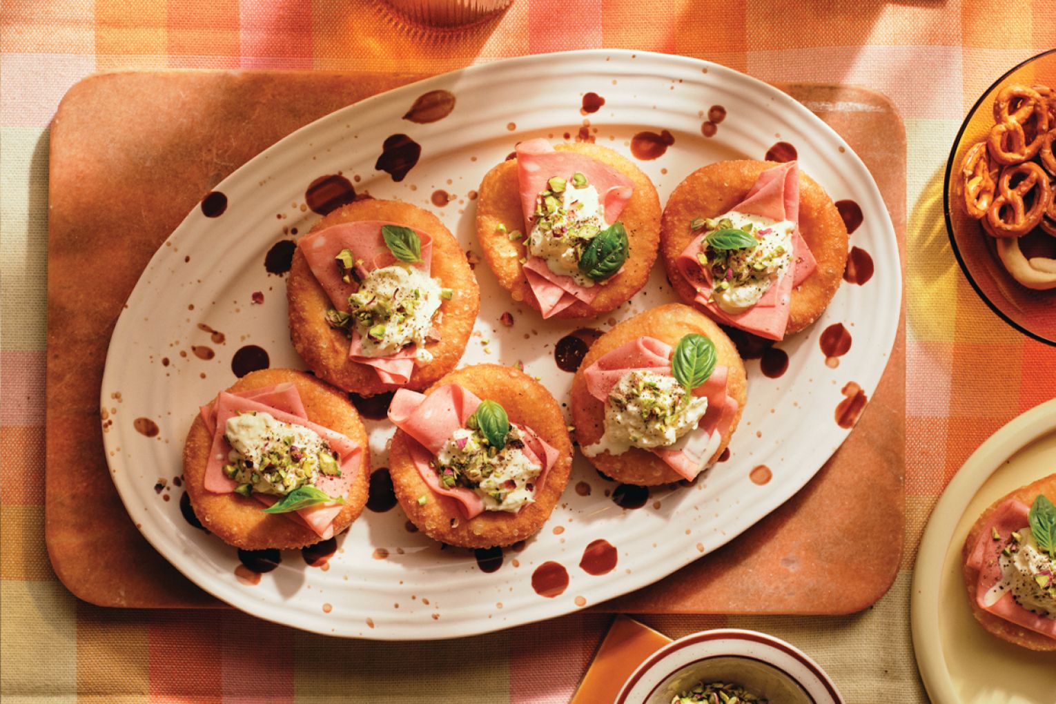To serve, place pizzas onto serving plate, top with half a slice of mortadella, a heaped teaspoon of stracciatella, a sprinkle of pistachio and a basil leaf.