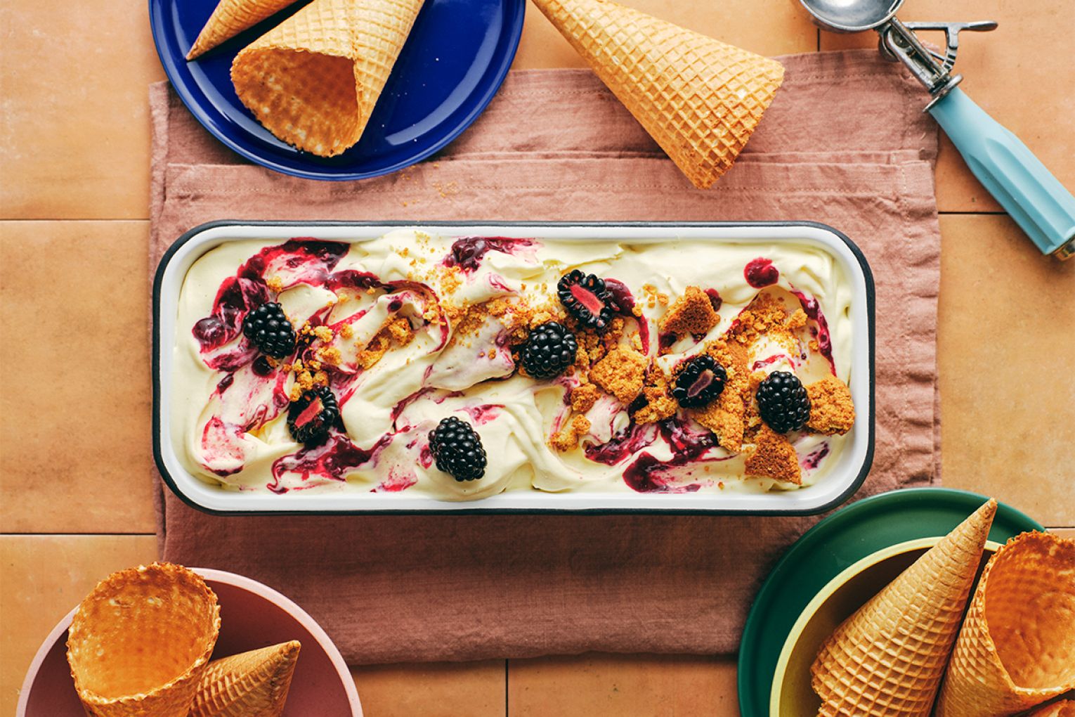 For blackberry ripple, place blackberries, sugar and 2 tbsp water in a small saucepan. Bring to the boil, then simmer for 5 minutes. Blitz half the mix with a stick blender, stir through the remaining mix and refrigerate to chill. Place a 1.2L capacity container in the freezer.
